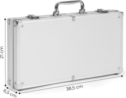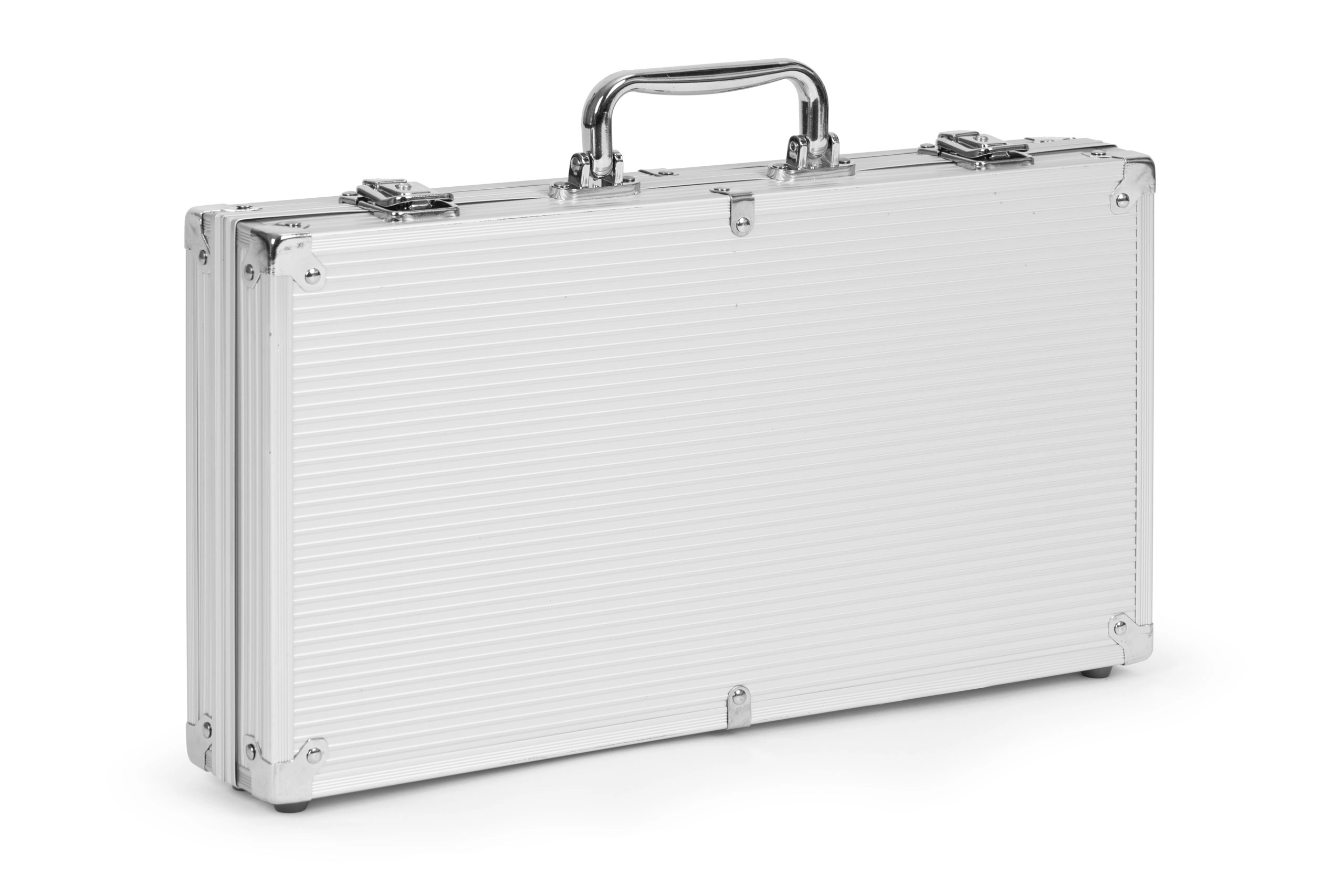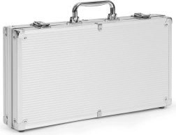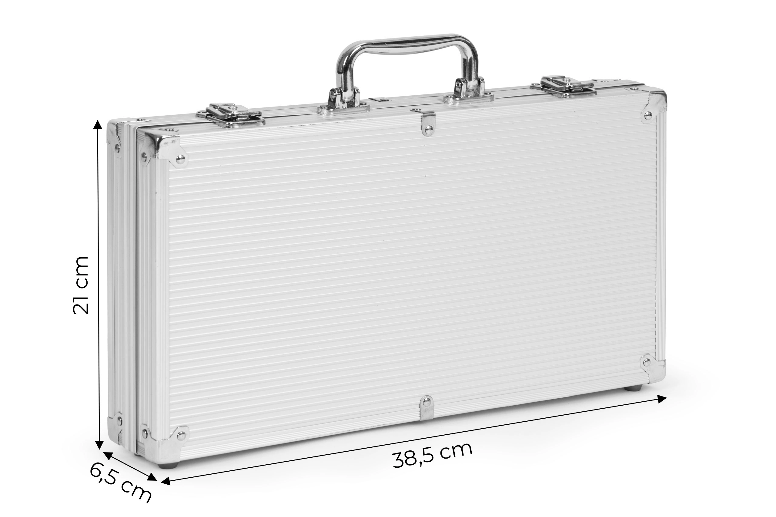 Комплектът се доставя в устойчиво метално куфарче, което го прави идеален за пренасяне. Куфарчето е заключващо се (включва два ключа), което предотвратява случайно отваряне и разпиляване на игровите елементи.