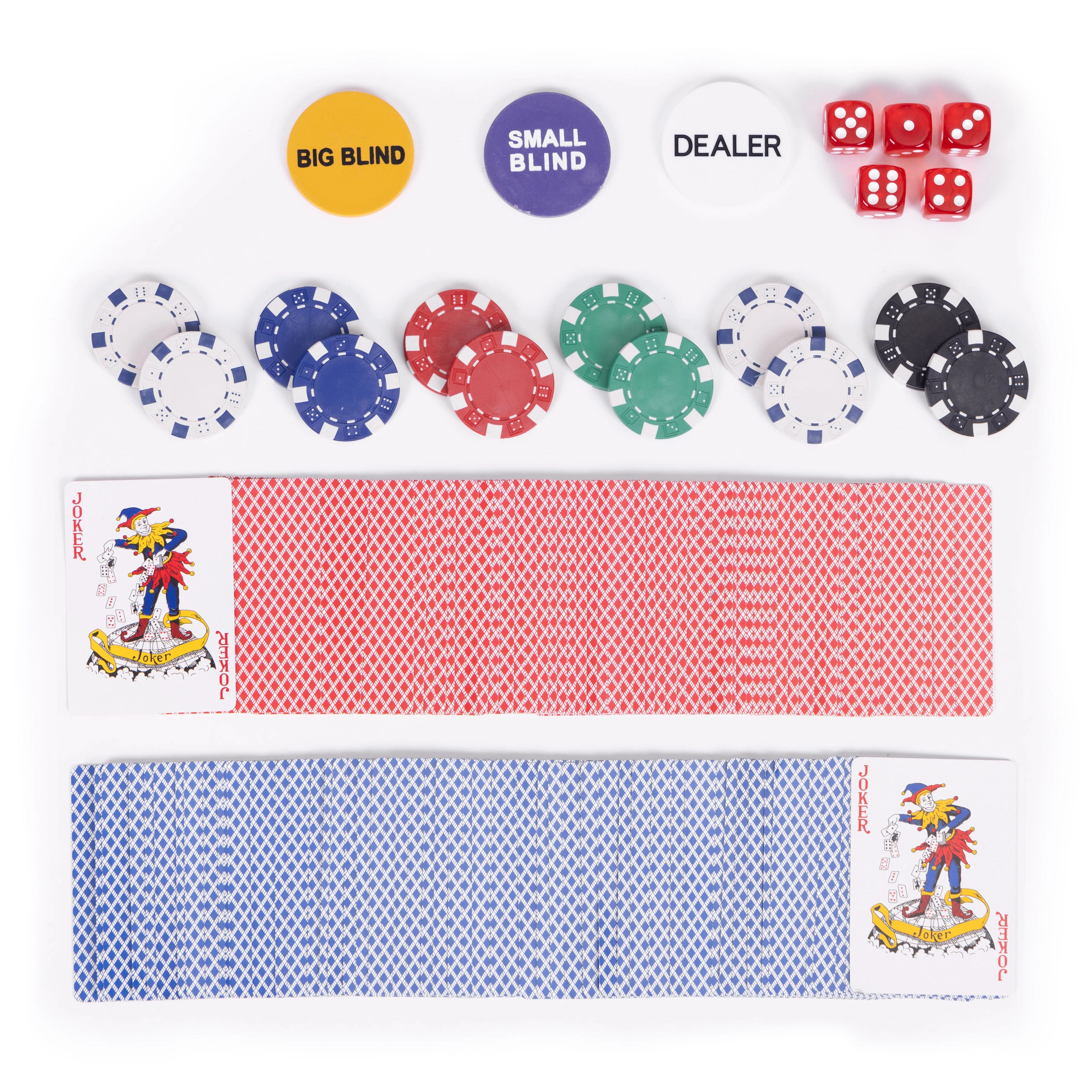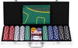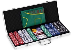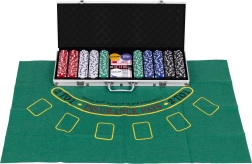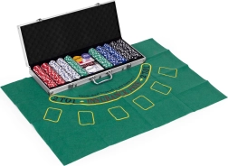 Съдържа 500 жетона, 2 тестета карти, зарове и игрална подложка. Всичко това в практичен заключващ се куфар.