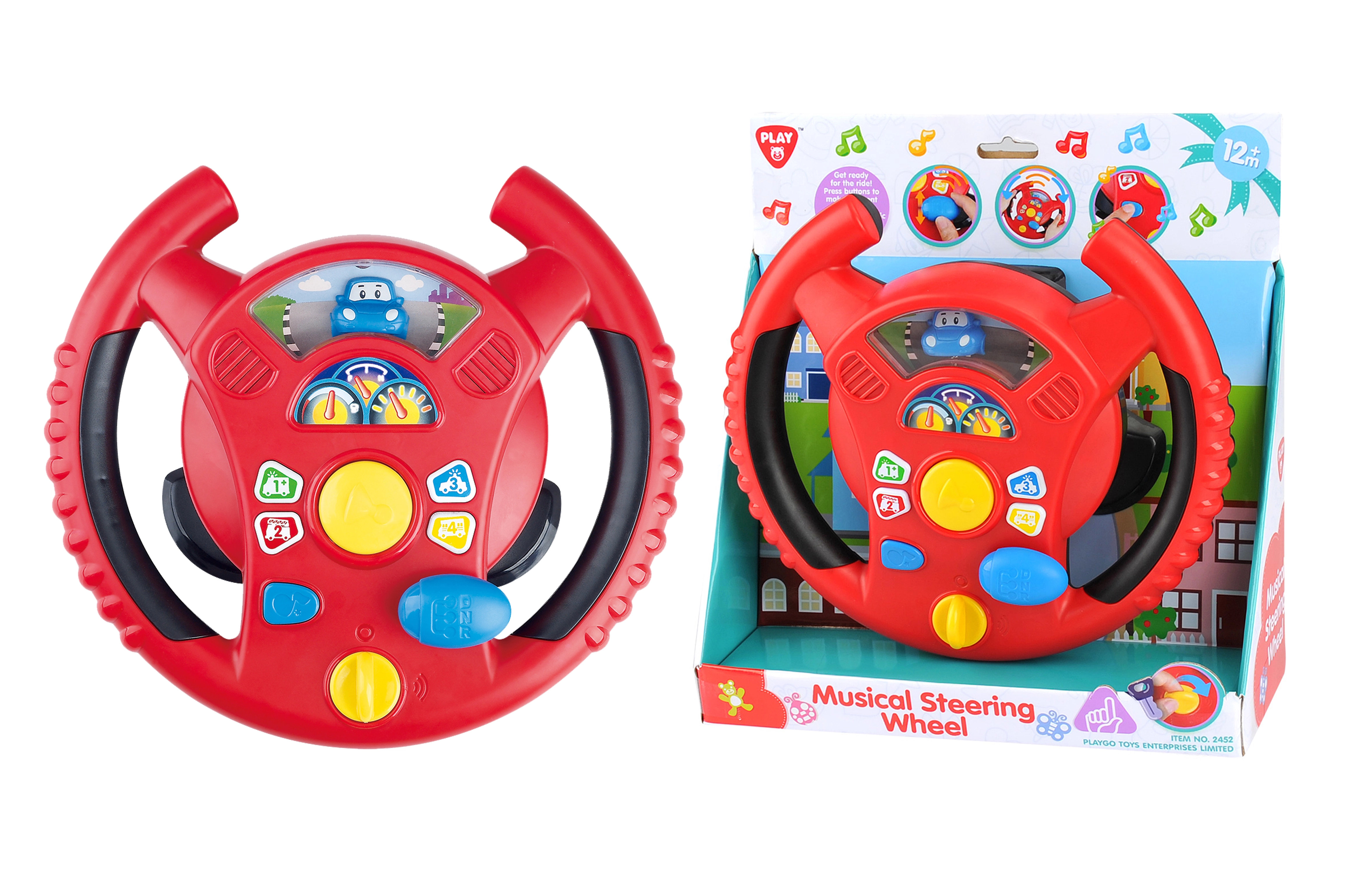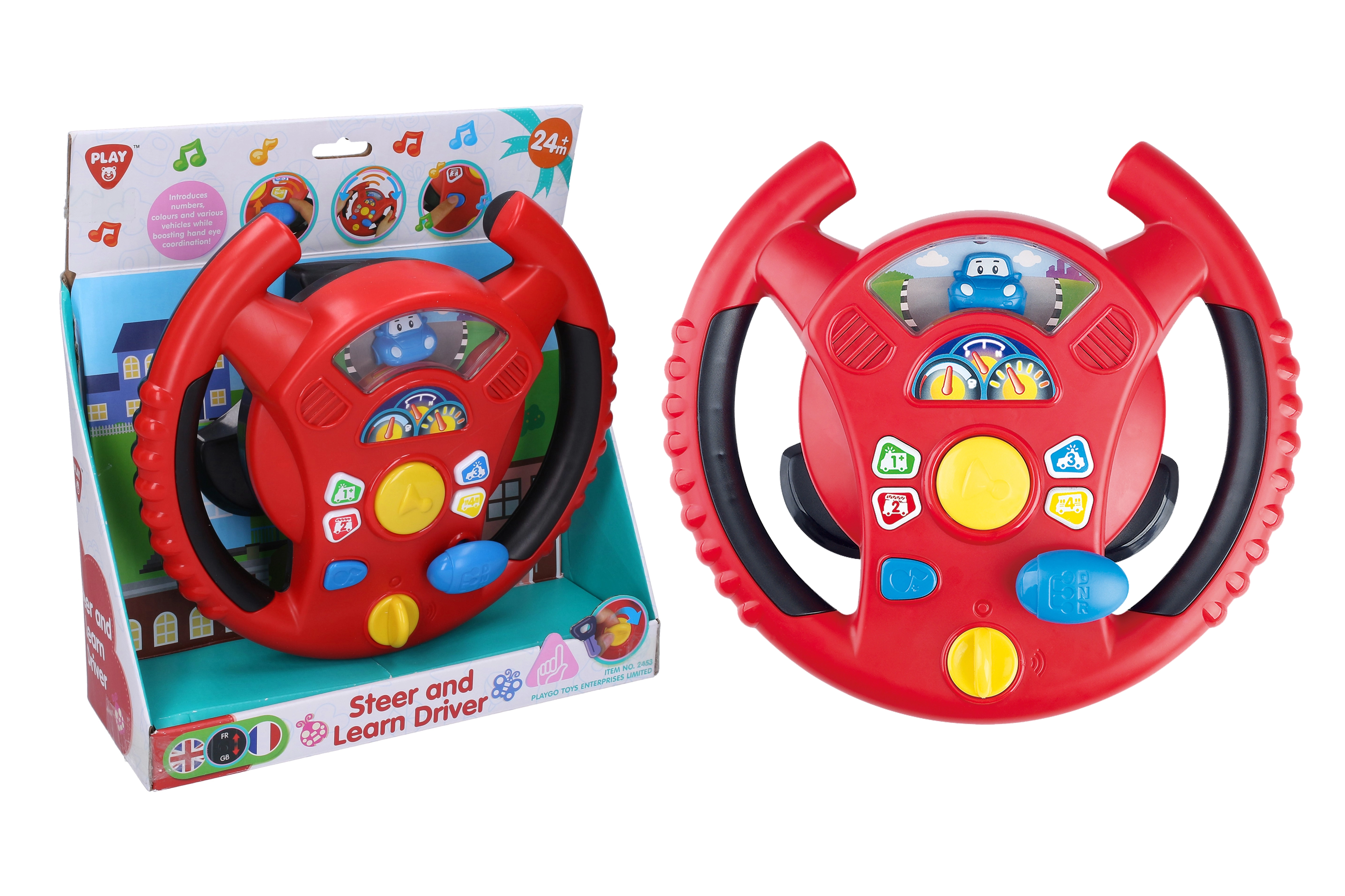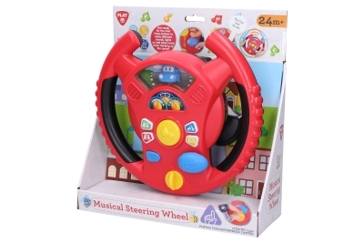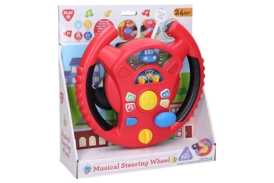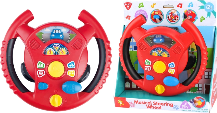 Интерактивният волан Playgo носи на децата забавна игра на шофиране в мини град. Въртящ се превключвател в долната част на волана служи за включване, в центъра ще намерите клаксон, вдясно – скоростен лост за звуци на шофиране, а по венеца на волана – малки бутони с тонове и мелодии. Децата ще се радват на реалистични ефекти, напомнящи истинска кола, докато развиват координацията и въображението си.