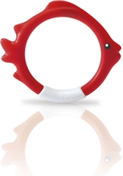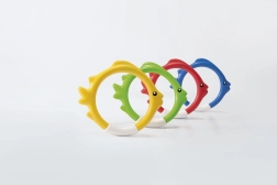 Забавен комплект от четири гмуркащи обръча във форма на рибки за деца от 6 години. Обръчите в цветове синьо, червено, зелено и жълто след пускане във водата стоят стабилно на дъното, което мотивира за тренировка по гмуркане и подобрява плувните умения. Изработени от мек и безопасен материал за лесно захващане.