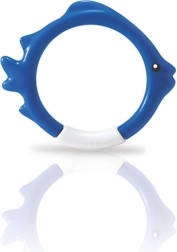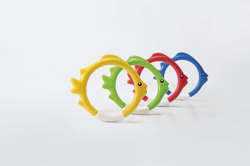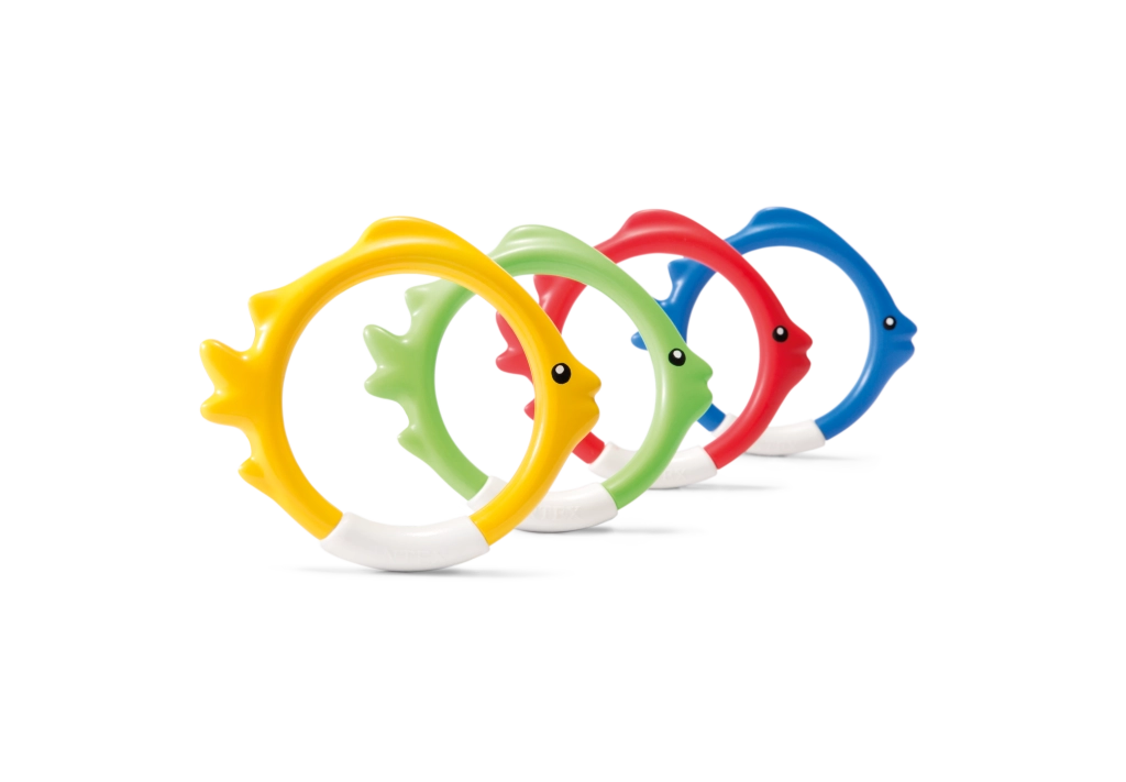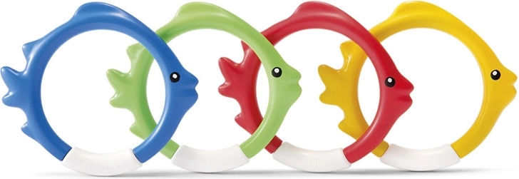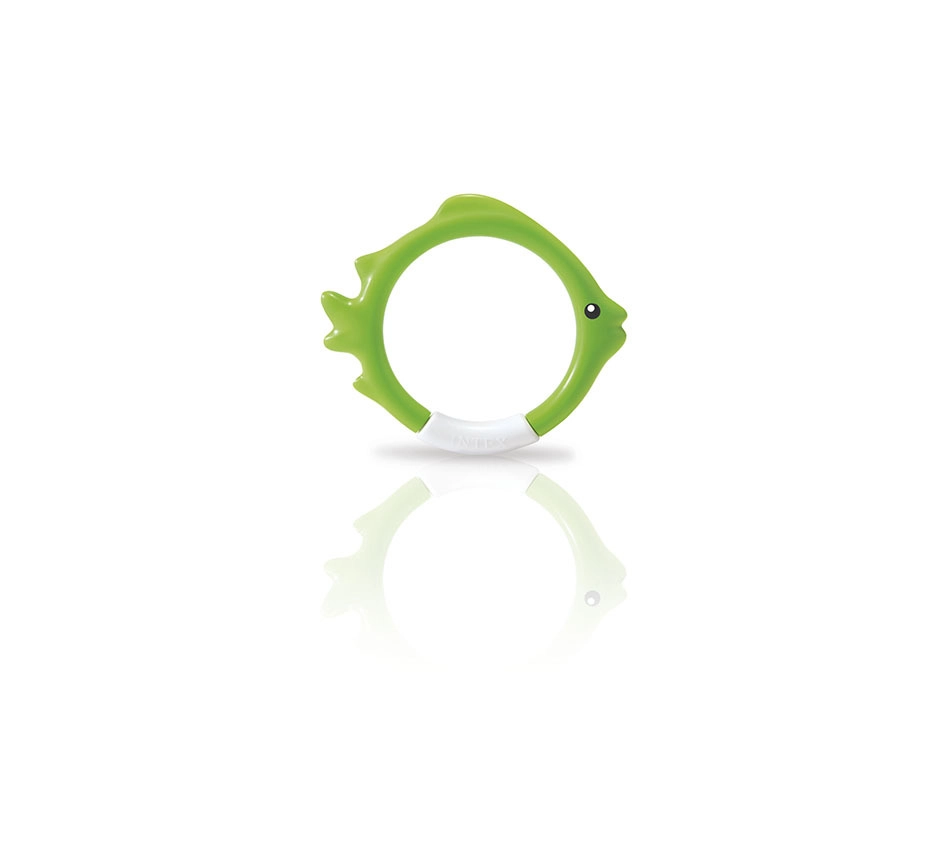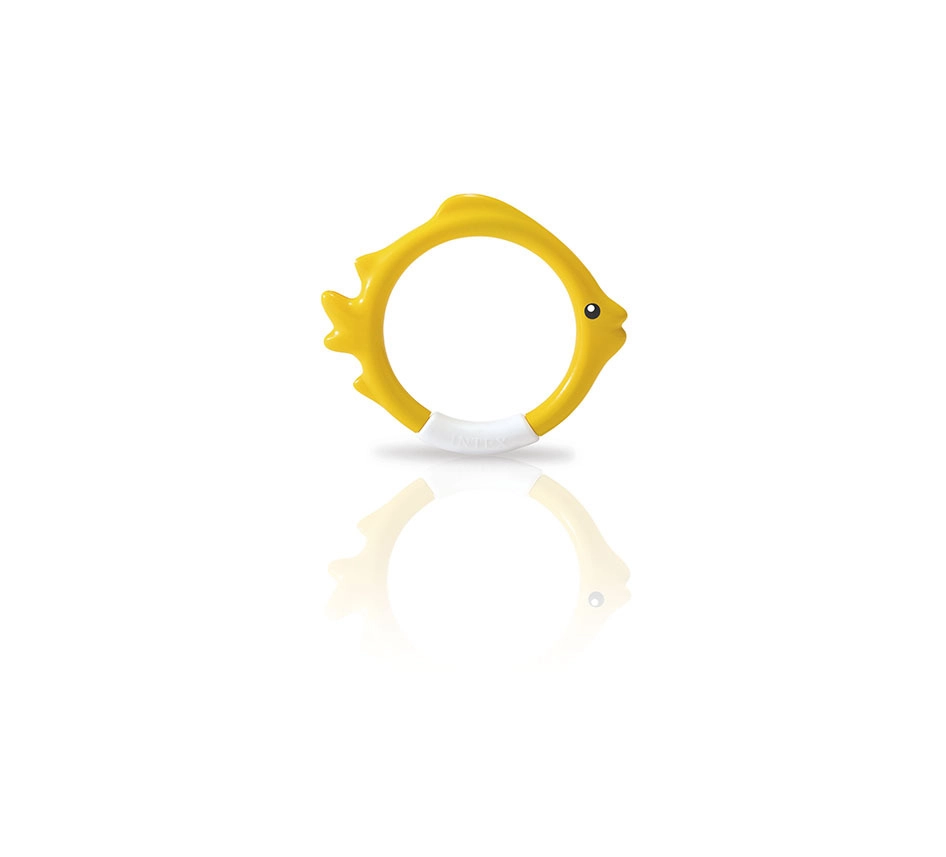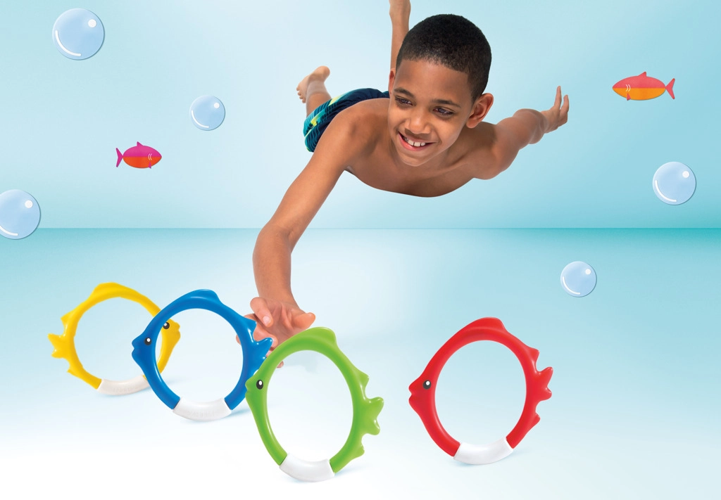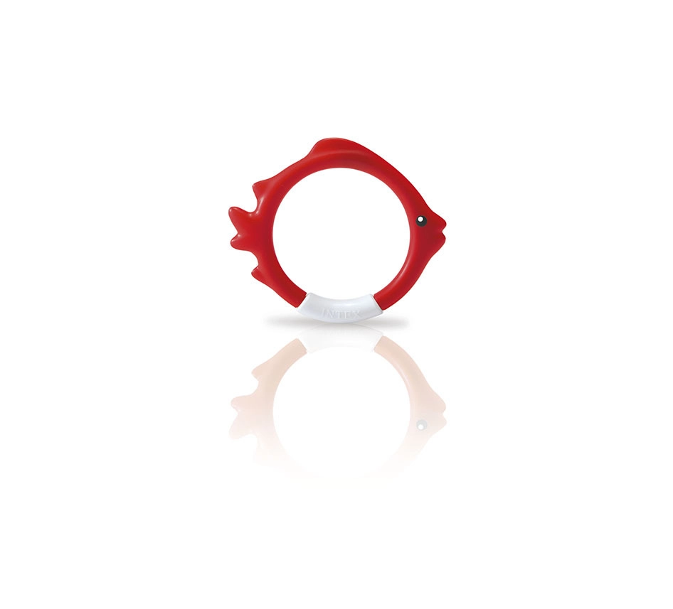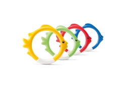 Комплектът гмуркащи обръчи INTEX във форма на риби е идеален помощник за игриво обучение по гмуркане. Благодарение на ярките цветове и стабилното стоене на дъното на басейна, децата лесно намират целта и с желание тренират задържане на дъх и ориентация под вода.