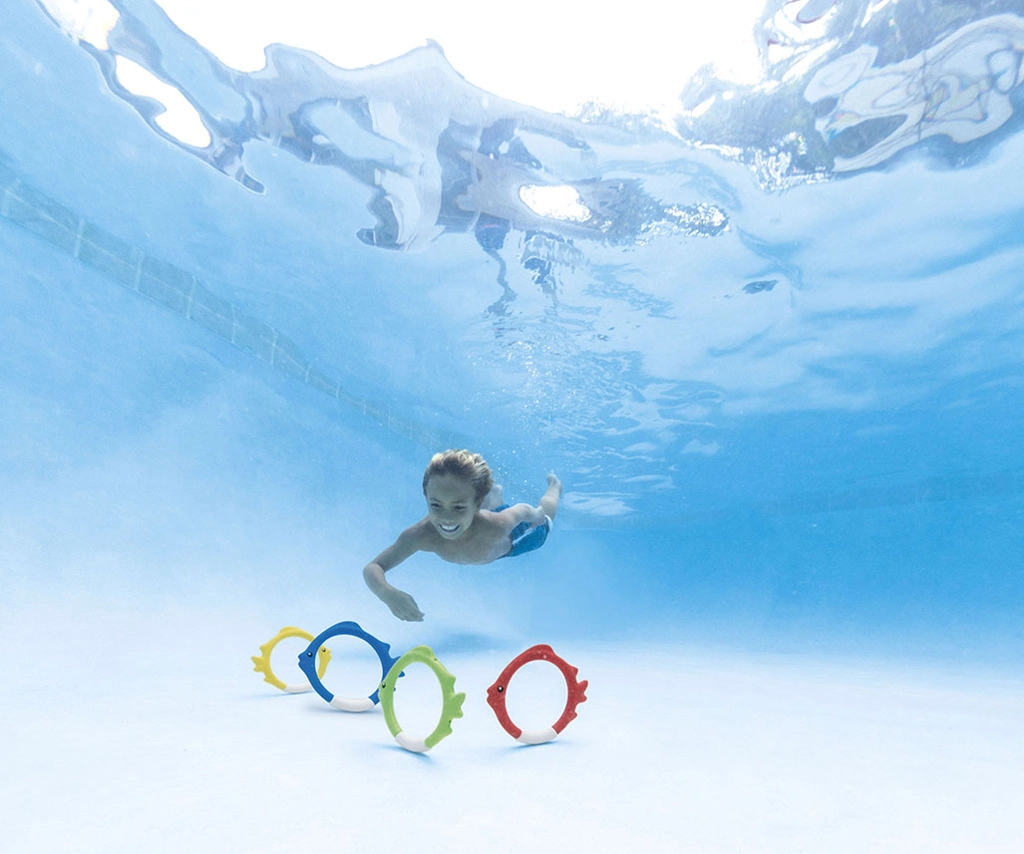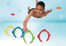 След пускане във водата обръчите автоматично застават на дъното, така че децата имат ясен целеви обект за потапяне и практикуват гмуркане по естествен и забавен начин.