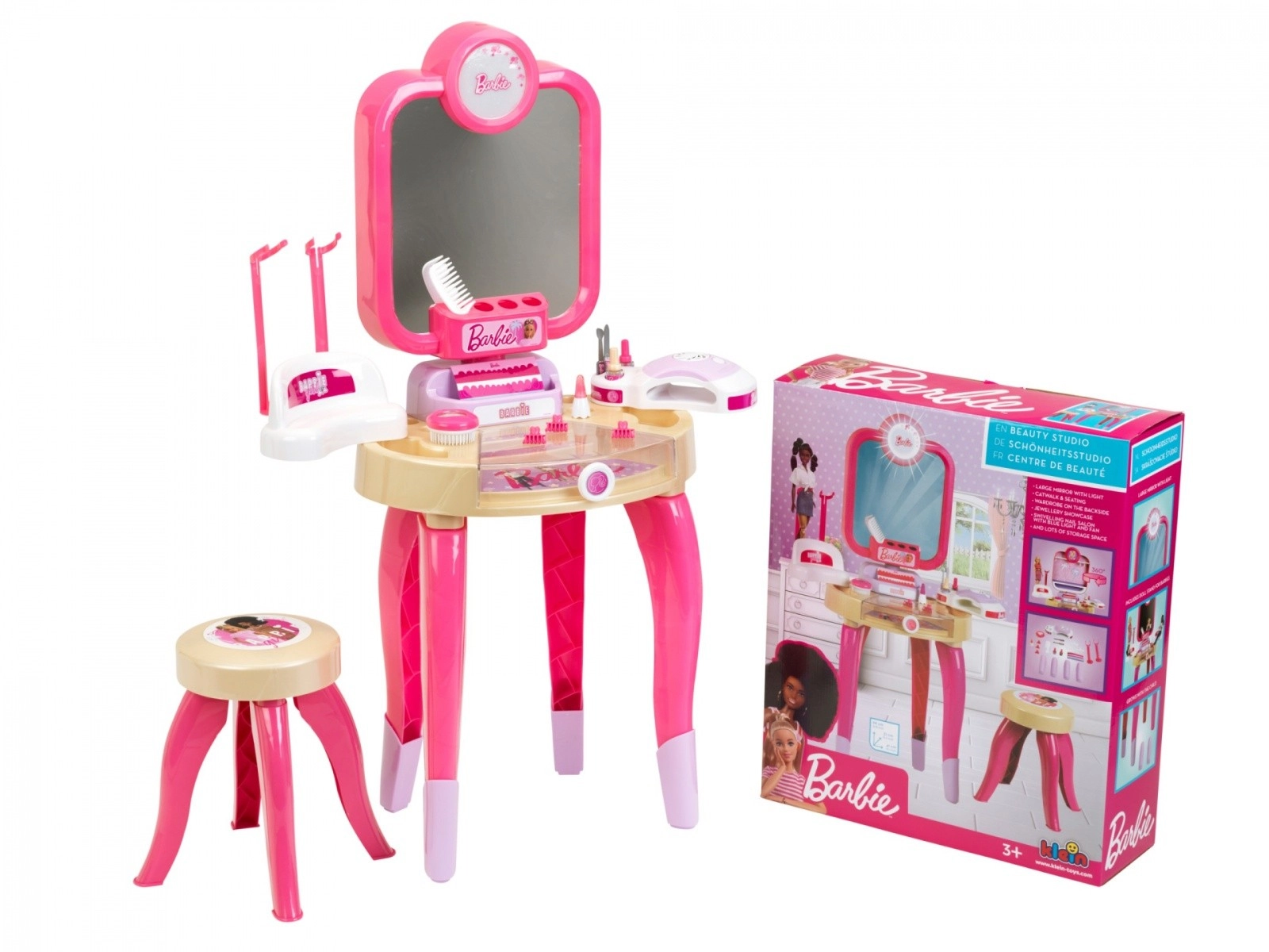Тоалетката Barbie носи на децата автентично изживяване като в козметичен салон. Благодарение на въртящото се огледало със светлини малките стилисти се виждат от всички страни и могат да създават перфектни прически. След това идва ред на игривия „маникюр“: сушилнята за нокти с въздушни и светлинни ефекти придава реалистичен нюанс на играта.
