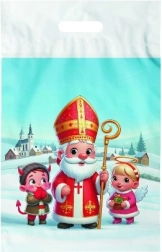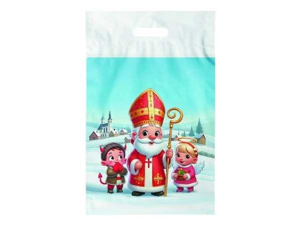 Практична пластмасова подаръчна торбичка с мотив на Св. Николай и отвор за захващане. Благодарение на здравата пластмаса е устойчива на скъсване и влага, идеална за коледни подаръци за Никулден, сладки и играчки. Размерът 29×46 см е подходящ и за по-обемни предмети.