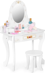Детската тоалетка ECOTOYS превръща стаята в малко бюти студио. Благодарение на здравата дървена конструкция и прецизната изработка без остри ръбове е безопасна и стабилна. Огледалото с декоративна корона насърчава ежедневните игри на гримьор, модел или принцеса, а големият плот предлага достатъчно място за всички принадлежности.