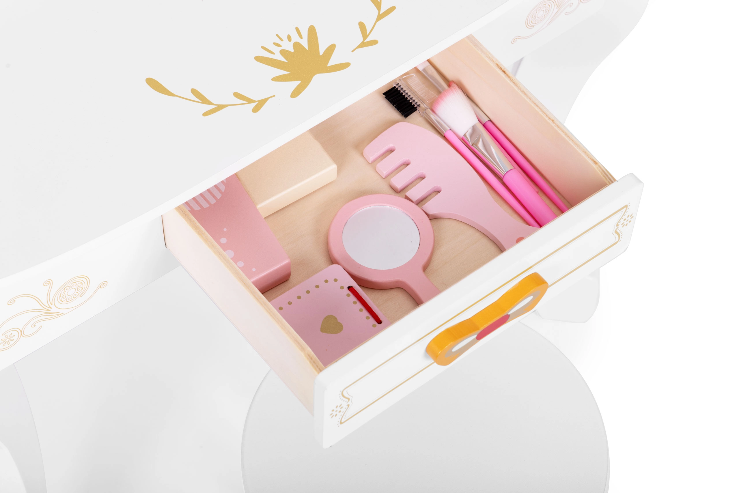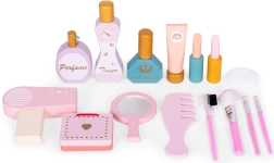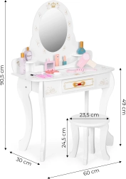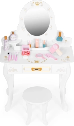 В комплект е включен набор от дървени играчки – козметични аксесоари, с които децата могат да имитират сутрешните ритуали на възрастните: сешоар, четка, малко огледалце, комплекти „козметика“ и четки. След игра всичко лесно се прибира в просторното издърпващо се чекмедже, така че масичката и стаята да са винаги подредени.