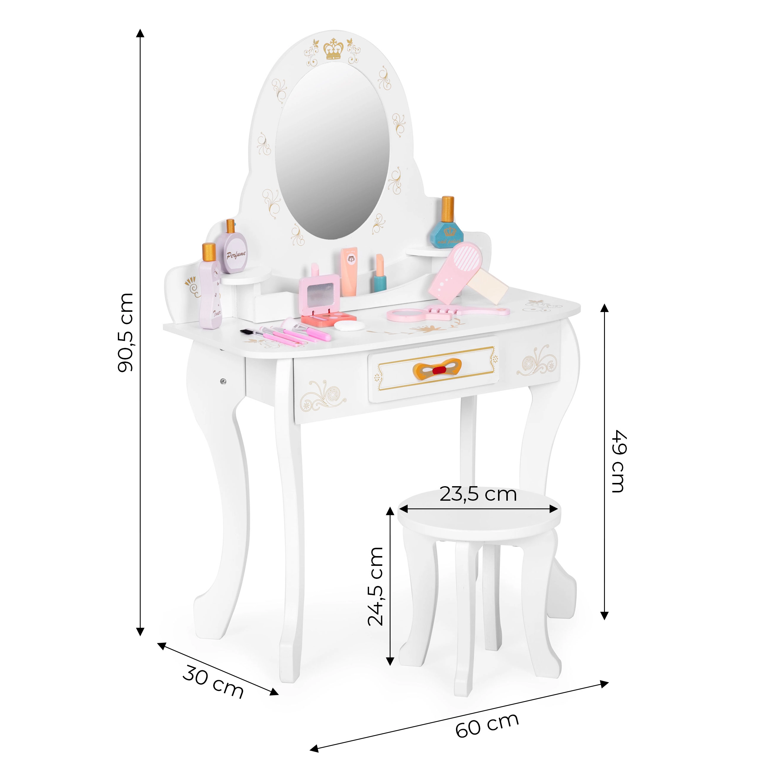 Стабилна масичка от дърво и MDF с декоративно огледало и корона. Облите ръбове и прецизната изработка осигуряват безопасна игра за деца от 3 години.