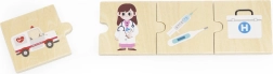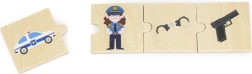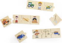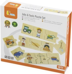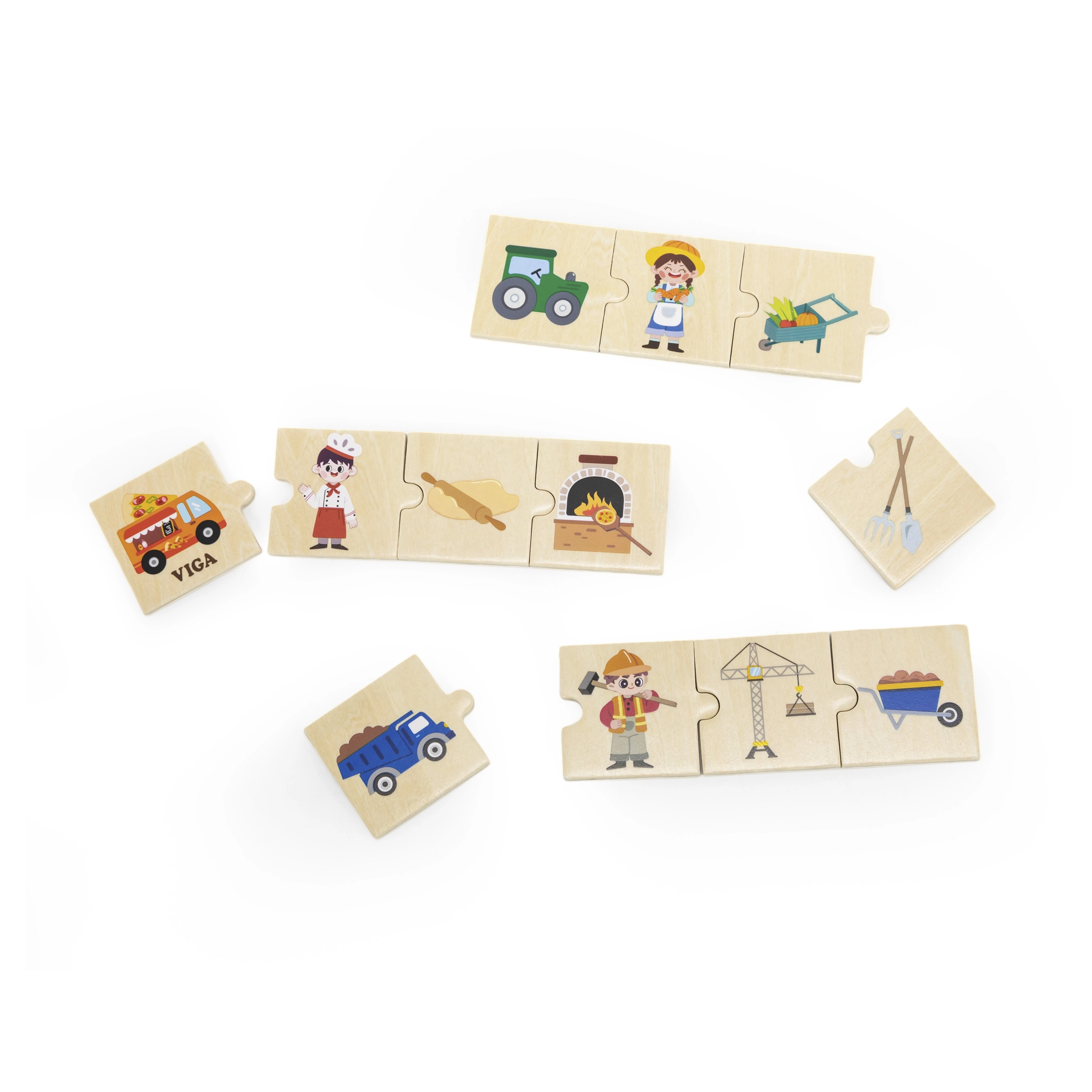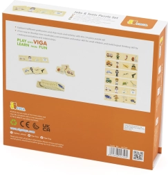 Образователният комплект VIGA включва 24 дървени части с красиви илюстрации, благодарение на които децата по забавен начин се запознават с 6 професии – например пожарникар, лекар, полицай, земеделец, строител и пекар – и съчетават с тях правилните инструменти и превозни средства. Цветните изображения подпомагат усвояването на нови думи и разширяват речниковия запас.