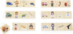 Децата съчетават персонажи (пожарникар, лекар, полицай, земеделец, строител, пекар) с подходящите им инструменти и превозни средства и по естествен начин обогатяват речника си.