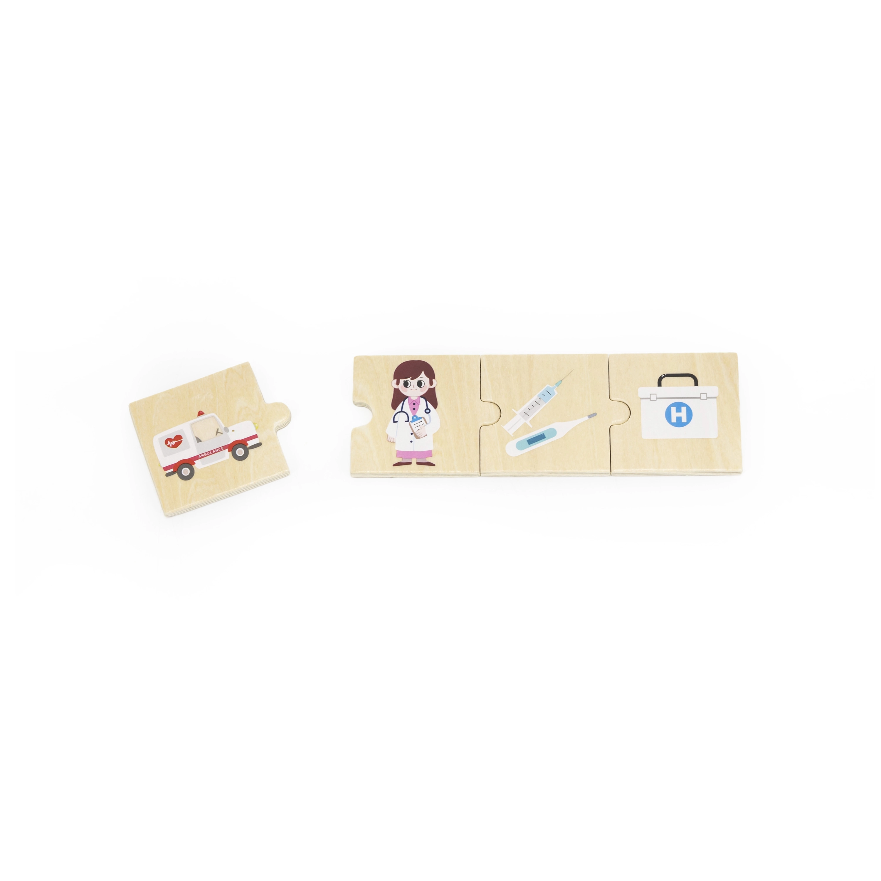 Открийте забавните дървени пъзели VIGA, които запознават децата от 18 месеца със света на професиите. В комплекта има 24 части, с които децата съчетават 6 професии с подходящите инструменти и превозни средства. Играта развива фината моторика, логическото мислене, вниманието и зрителната координация. Изработено от бук и оцветено с нетоксични бои – безопасно, издръжливо и идеално като подарък.