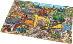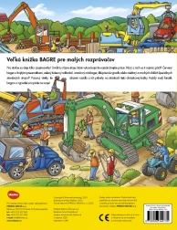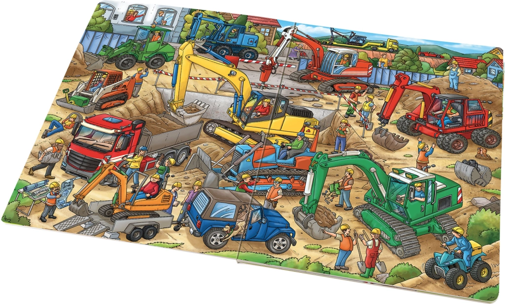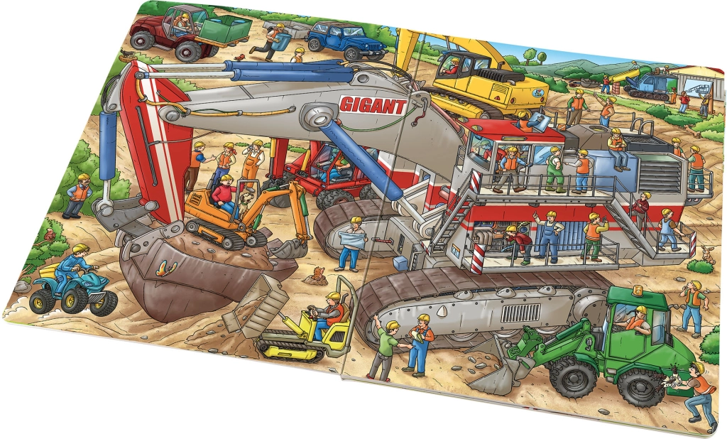 Тази голяма илюстрована книга ще зарадва всички деца, очаровани от света на строителните площадки. Вътре ще открият реалистично изобразен червен багер с двойни гуми, зелен колесен товарач, оранжев минибагер и жълта верижна машина – и много други помощници, които участват в създаването на нови постройки. Благодарение на твърдите страници издържа на често разлистване и впечатлява с ярки цветове и богати детайли.