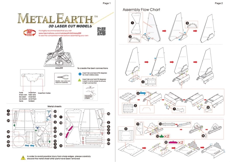 Комплектът съдържа 2 стоманени листа с части и илюстрирано ръководство. Сглобяването е без лепило – частите се свързват с помощта на заключващи елементи и огънати езичета. Препоръчва се работа с малки клещи и резачки (не са включени в комплекта).