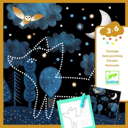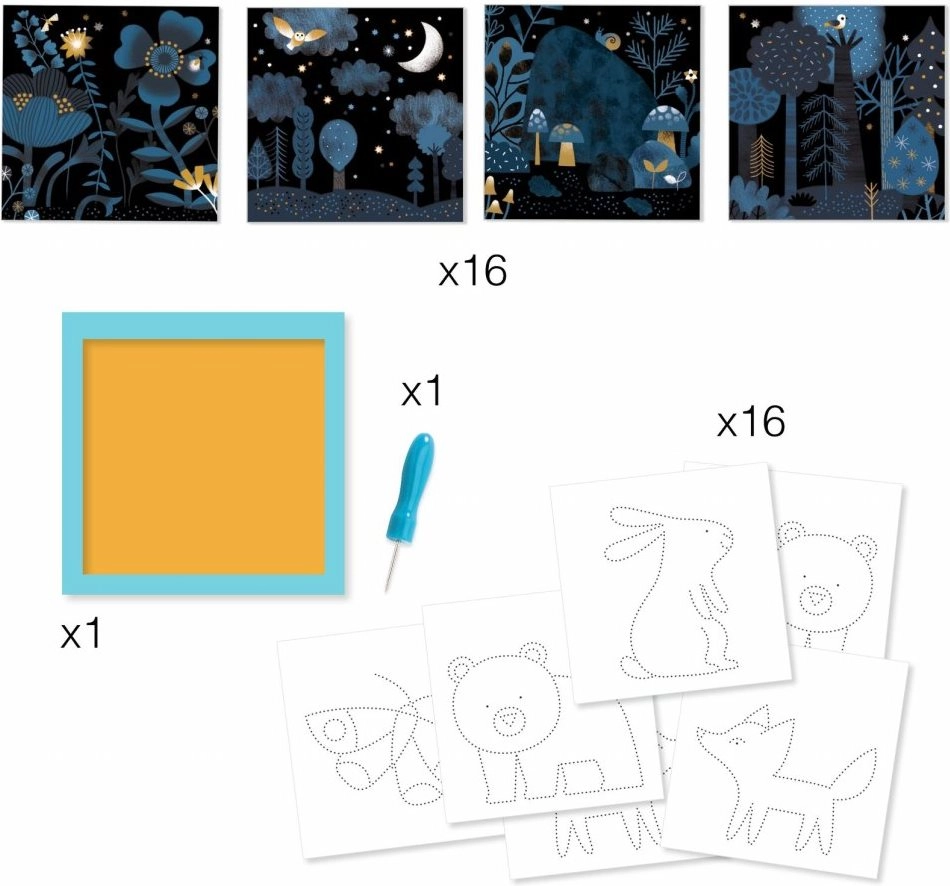В кутията ще намерите всичко необходимо: 16 илюстрирани фона, 16 шаблона, перфорираща игла, здрав държач и илюстрирана книжка с инструкции. Материалите са от хартия и картон с FSC сертификат, така че творчеството е не само креативно, но и щадящо природата.