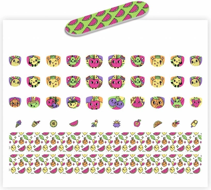 DJECO Стикери за нокти Плодове позволяват на децата да създадат красива маникюра без лак за нокти. Комплектът е забавен, лесен за използване и щадящ детските нокти.