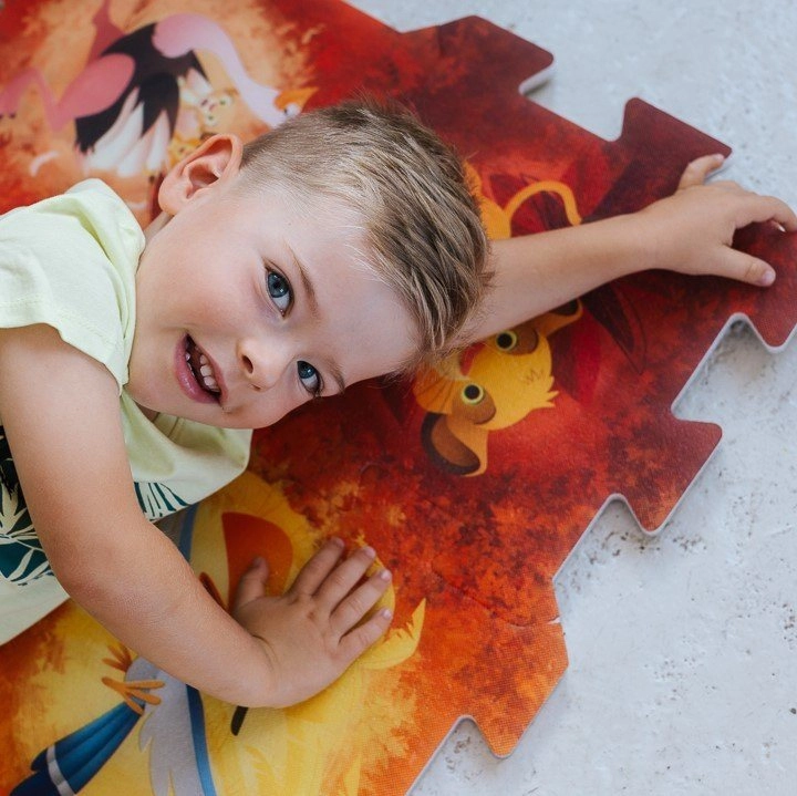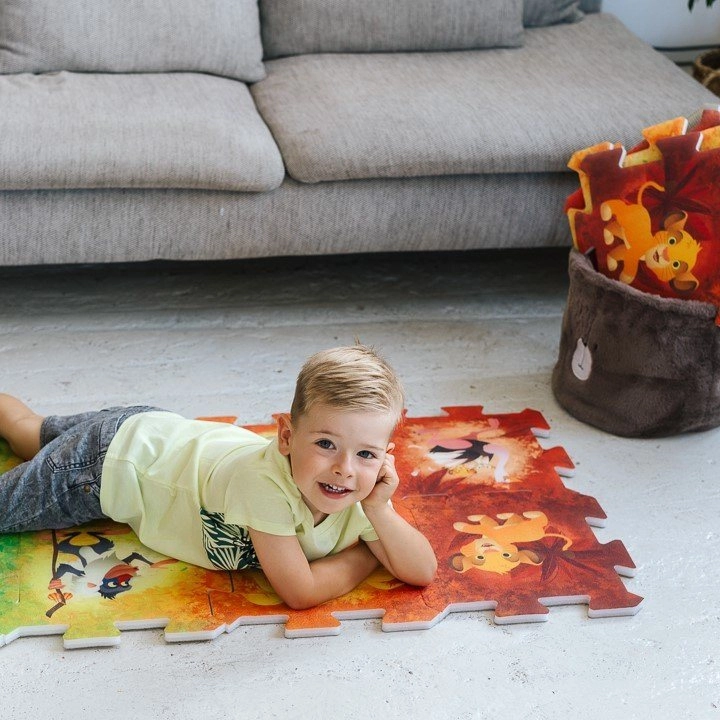 Открийте забавния и безопасен пенов пъзел Цар Лъв TREFL, който предлага на децата мека игрова повърхност и креативно строене. Благодарение на надстандартната дебелина 1,5 cm подложката е удобна, миема, безвредна за здравето и лесна за поддръжка. От осем части създавате площ около 117 × 60 cm или различни 3D форми.