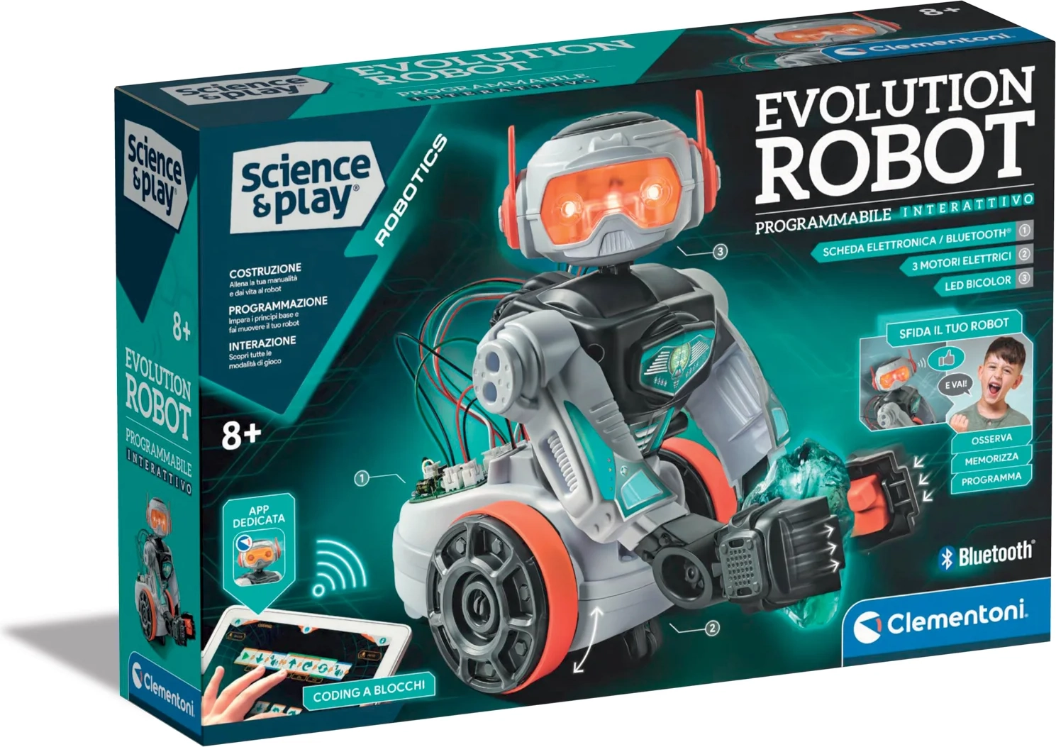 Открийте забавния път към света на роботиката със сглобяемия комплект Clementoni Science & Play Еволюционен робот. Децата сами сглобяват и програмират робота, като развиват логическо мислене, мануални умения и умения за решаване на проблеми. Специалното приложение ги въвежда по игрови начин в кодирането, докато роботът с подвижни рамена, електромотори, Bluetooth, високоговорител и LED светлини предлага много интерактивно забавление.