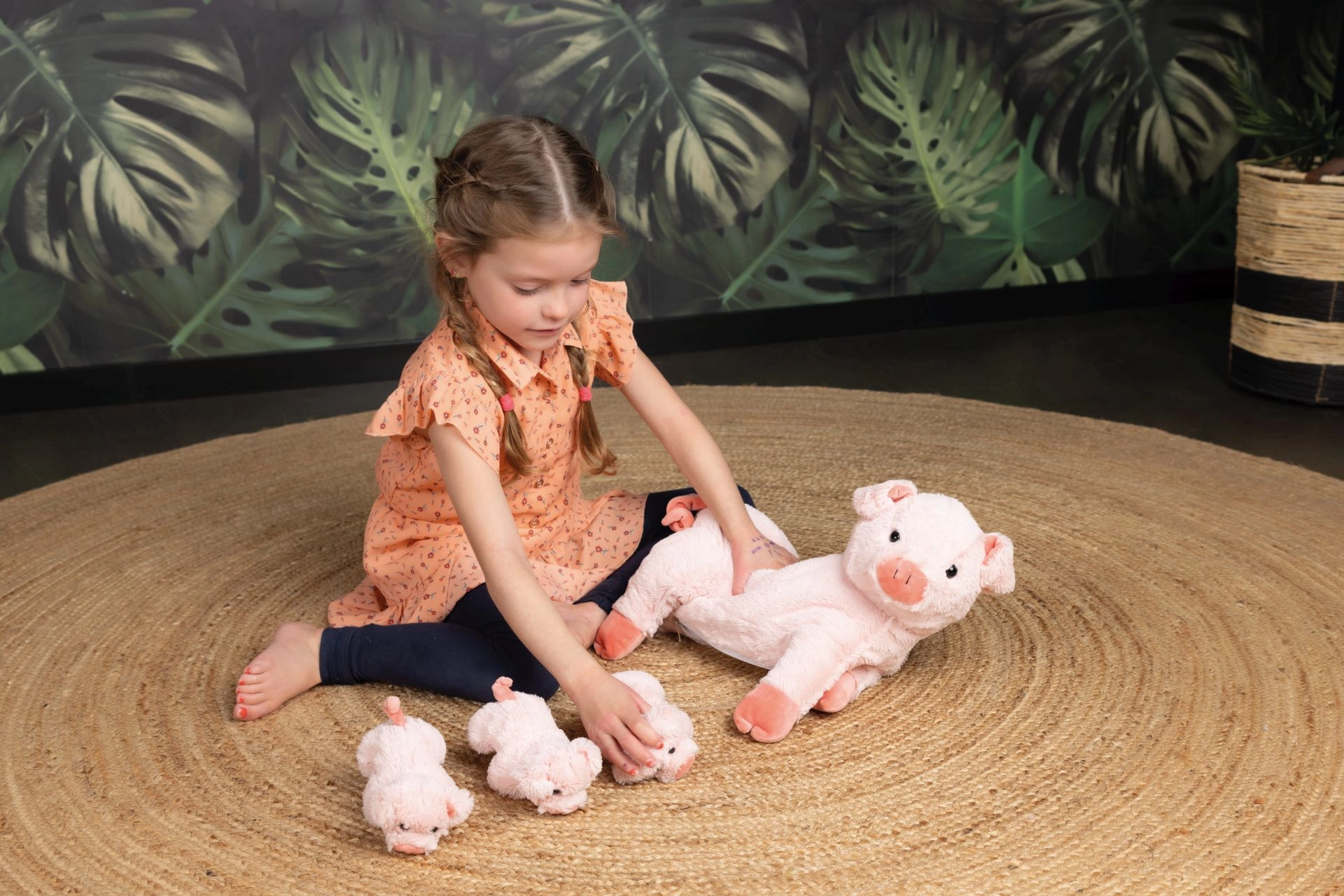Комплектът плюшени играчки Прасенца с Мама предлага много мек и приятен материал, който е идеален за прегръдки и игра. Мама има на коремчето практичен цип, с който могат да се открият малките прасенца, скрити вътре, което е чудесно за развитие на емоциите и грижовните умения у децата. Тази функция е и практична за пътуване, тъй като малките могат да бъдат безопасно прибрани.