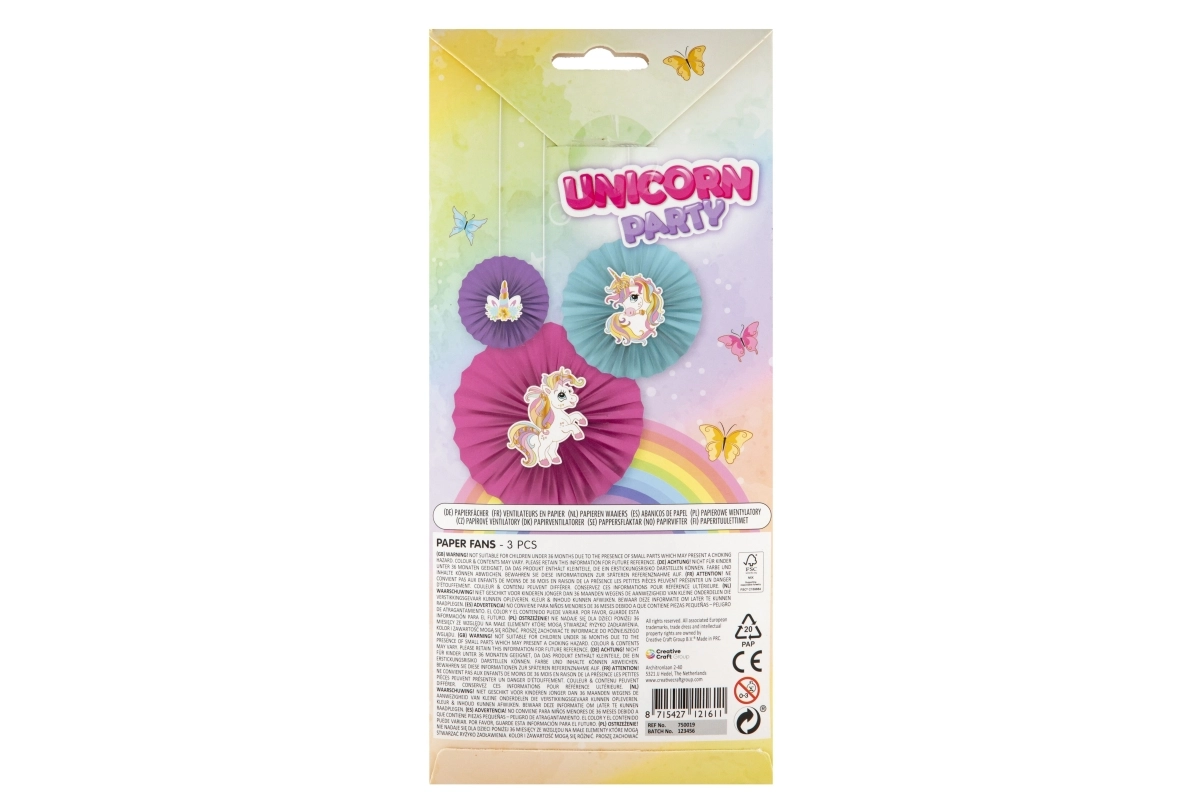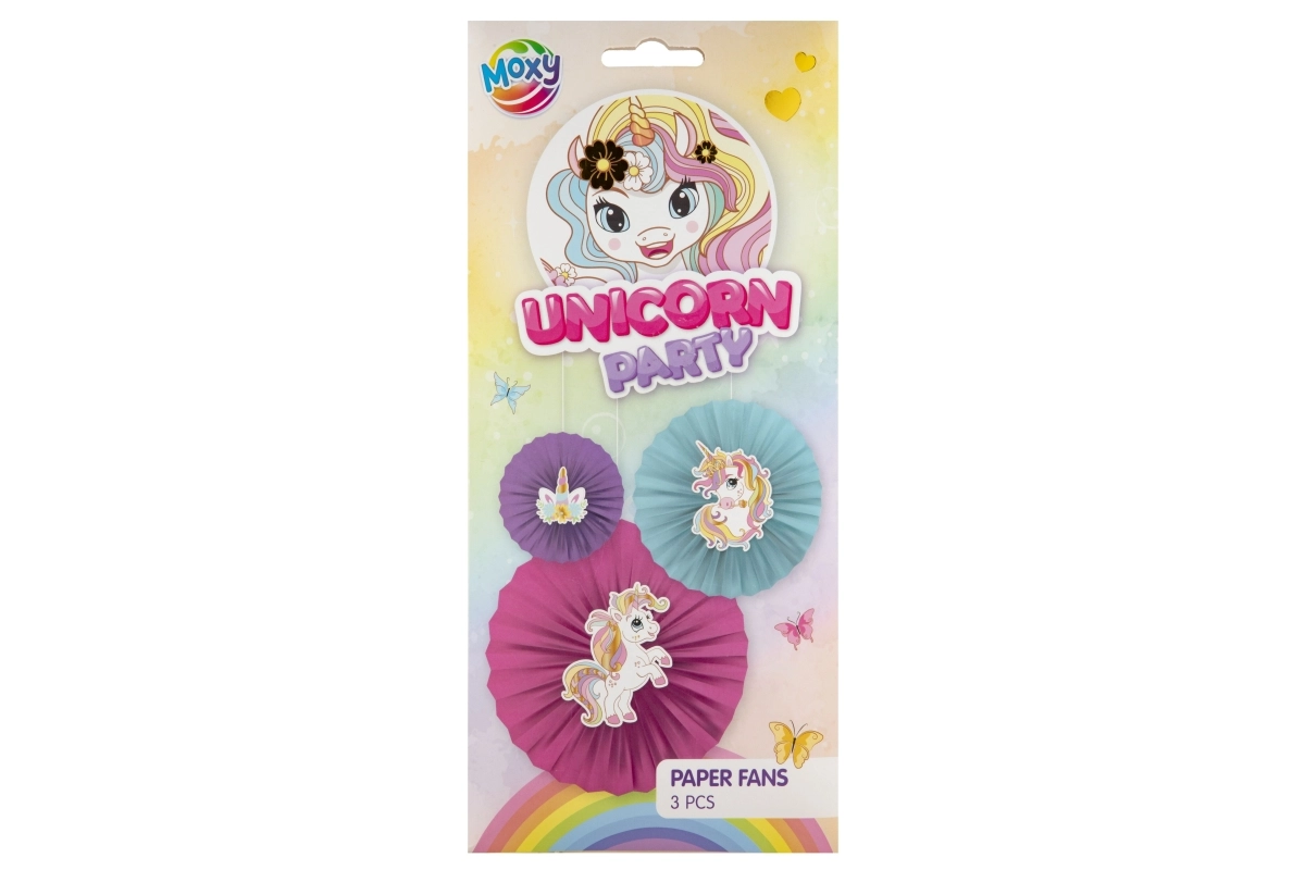 Украси всяко парти с магическа атмосфера с тези хартиени ветрила с мотив еднорог. В комплекта има 3 цветни броя (розов, син, лилав), идеални за декорация на детски рождени дни, тематични партита и фотокът.