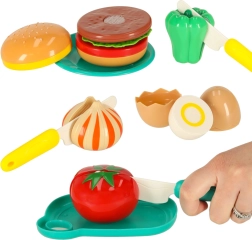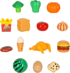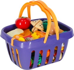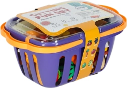 Пъстър комплект пластмасови храни за деца, който развива фината моторика, познаването на готвенето и креативната игра на готвач. Частите се свързват с помощта на велкро, така че храните могат да се „режат“ с безопасен пластмасов нож и да се сглобяват отново. Включени са тави, чинии и детски прибори, а всичко е събрано в практична кошничка с дръжки за лесно пренасяне и съхранение.