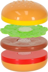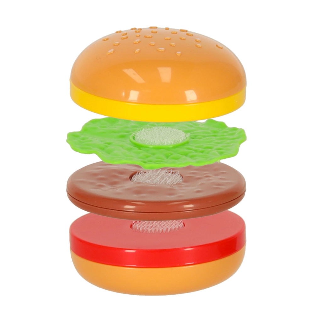 Обширният комплект за детската кухня включва всичко нужно за малките готвачи: пица на парчета, хамбургер, зеленчуци, плодове и сладкиши. Частите са разделени на половини и свързани с велкро, така че децата могат безопасно да тренират рязане, сервиране и приготвяне на меню за цялото семейство.