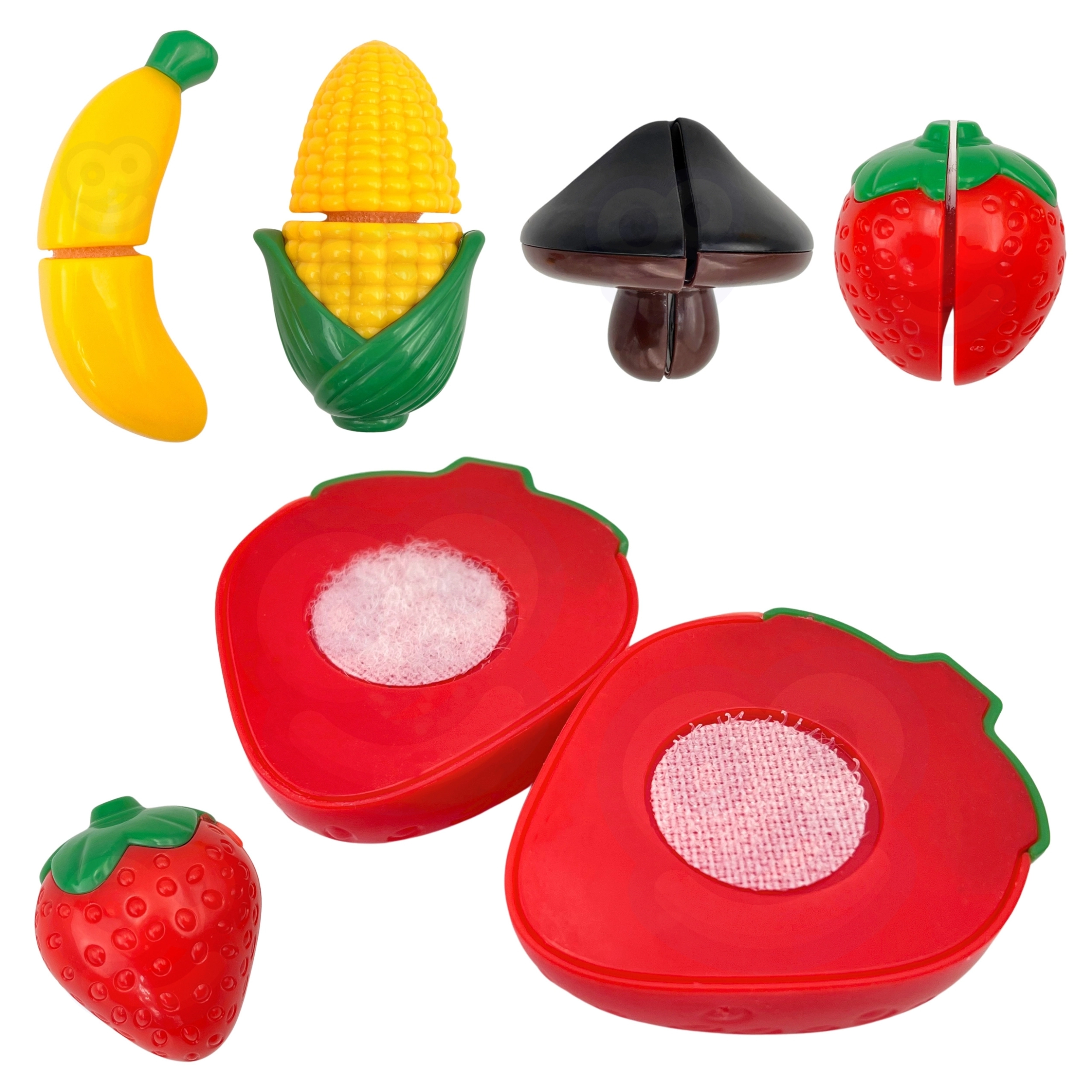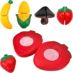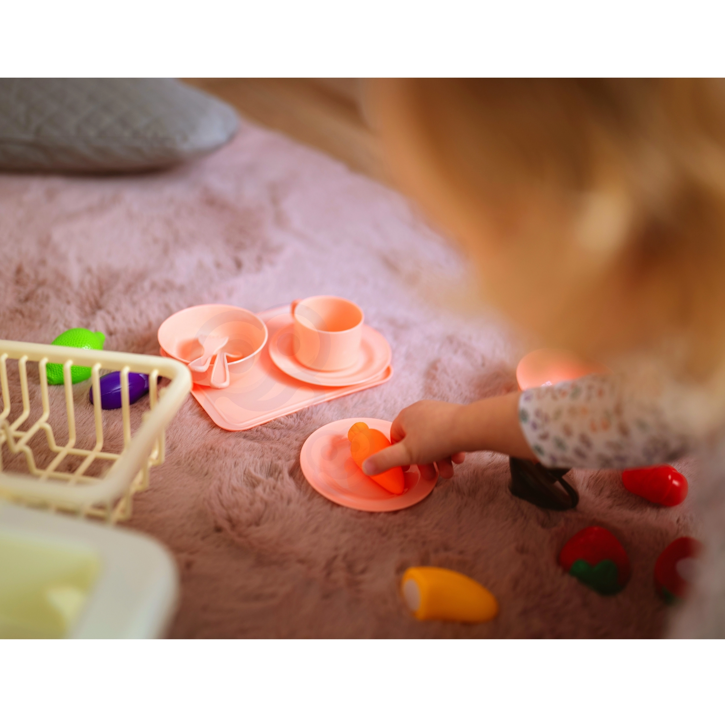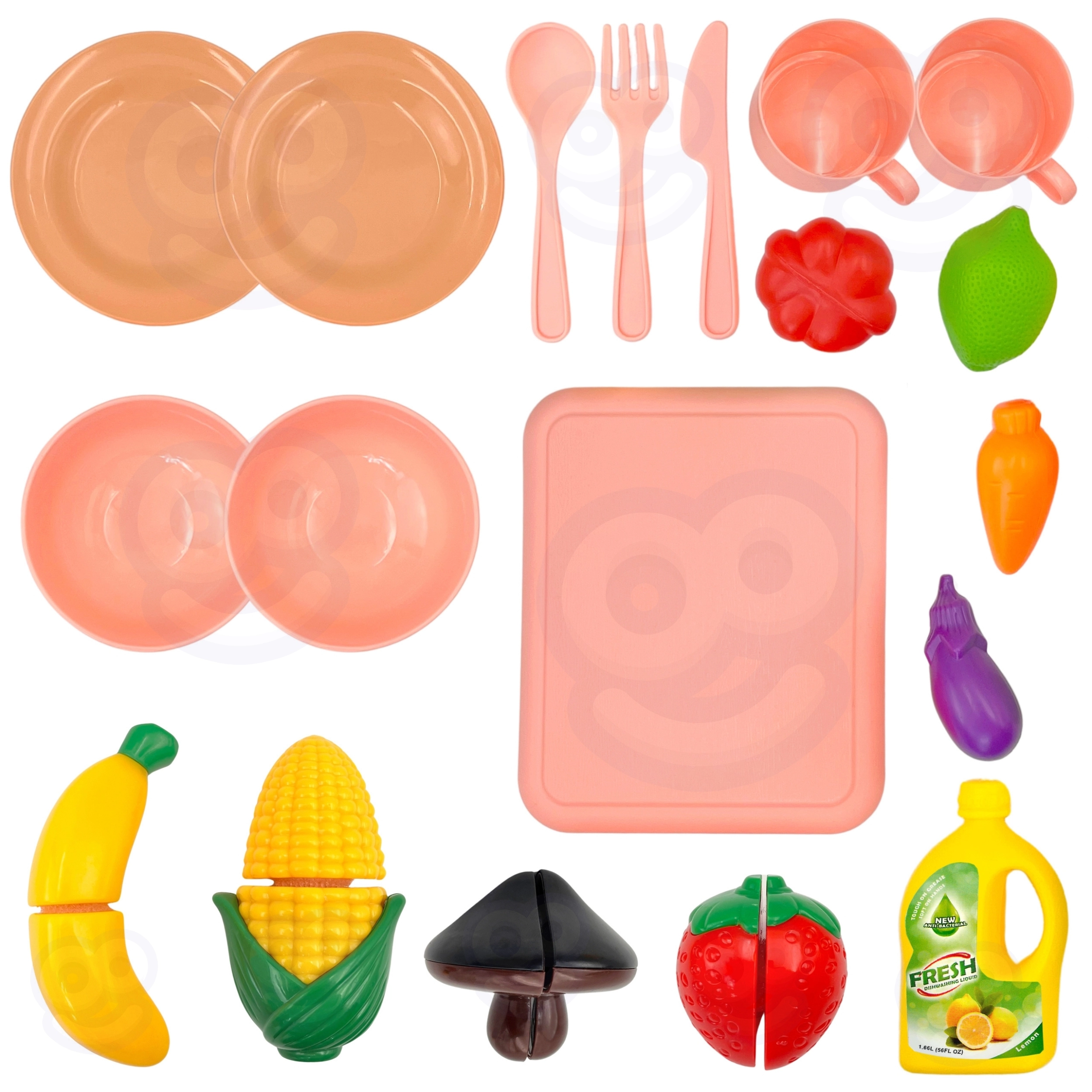 Чинийки, купички, чашки, прибори, каничка и плодове и зеленчуци за рязане със сух цип – всичко за реалистично сервиране и почистване след угощение.