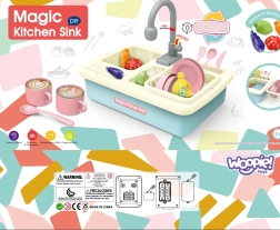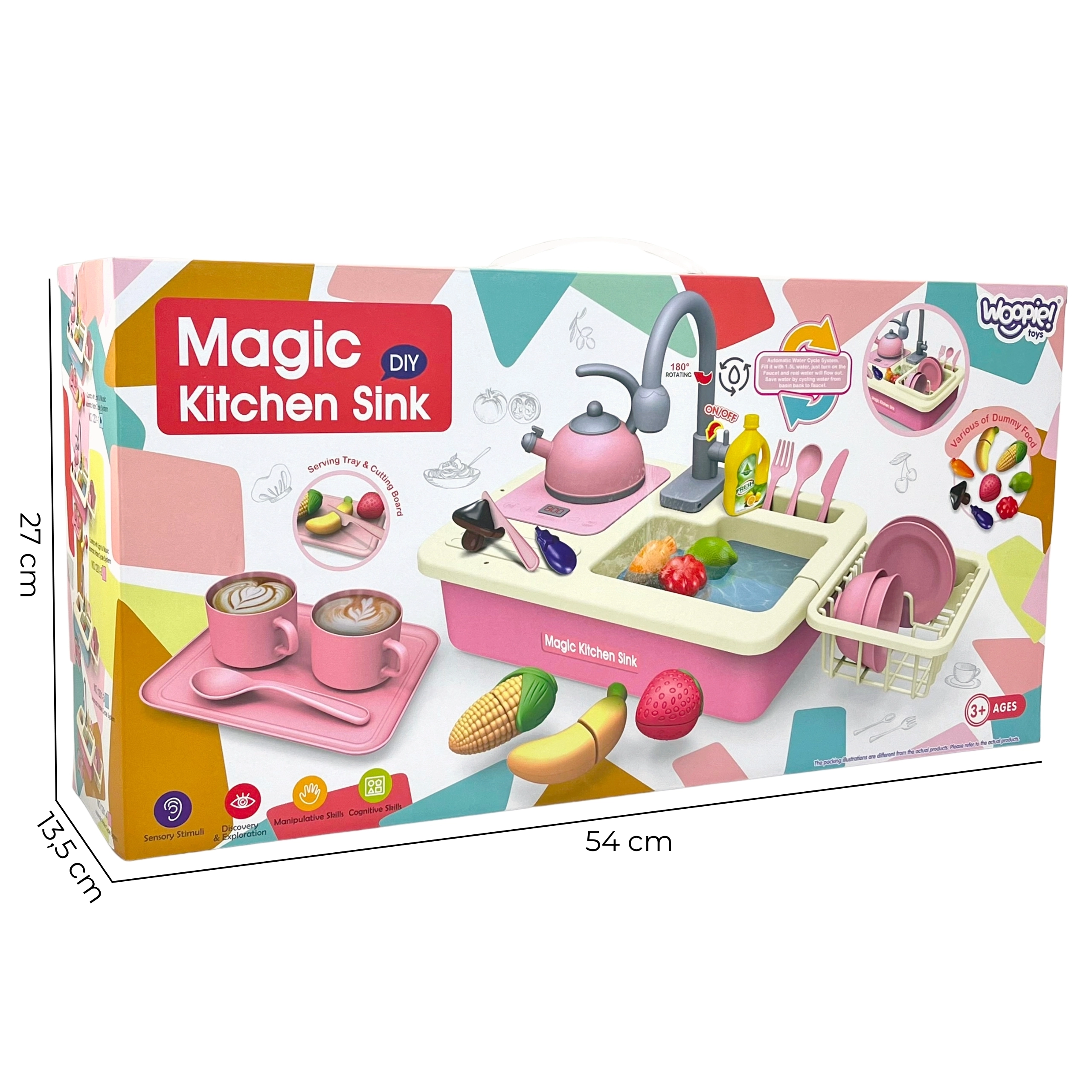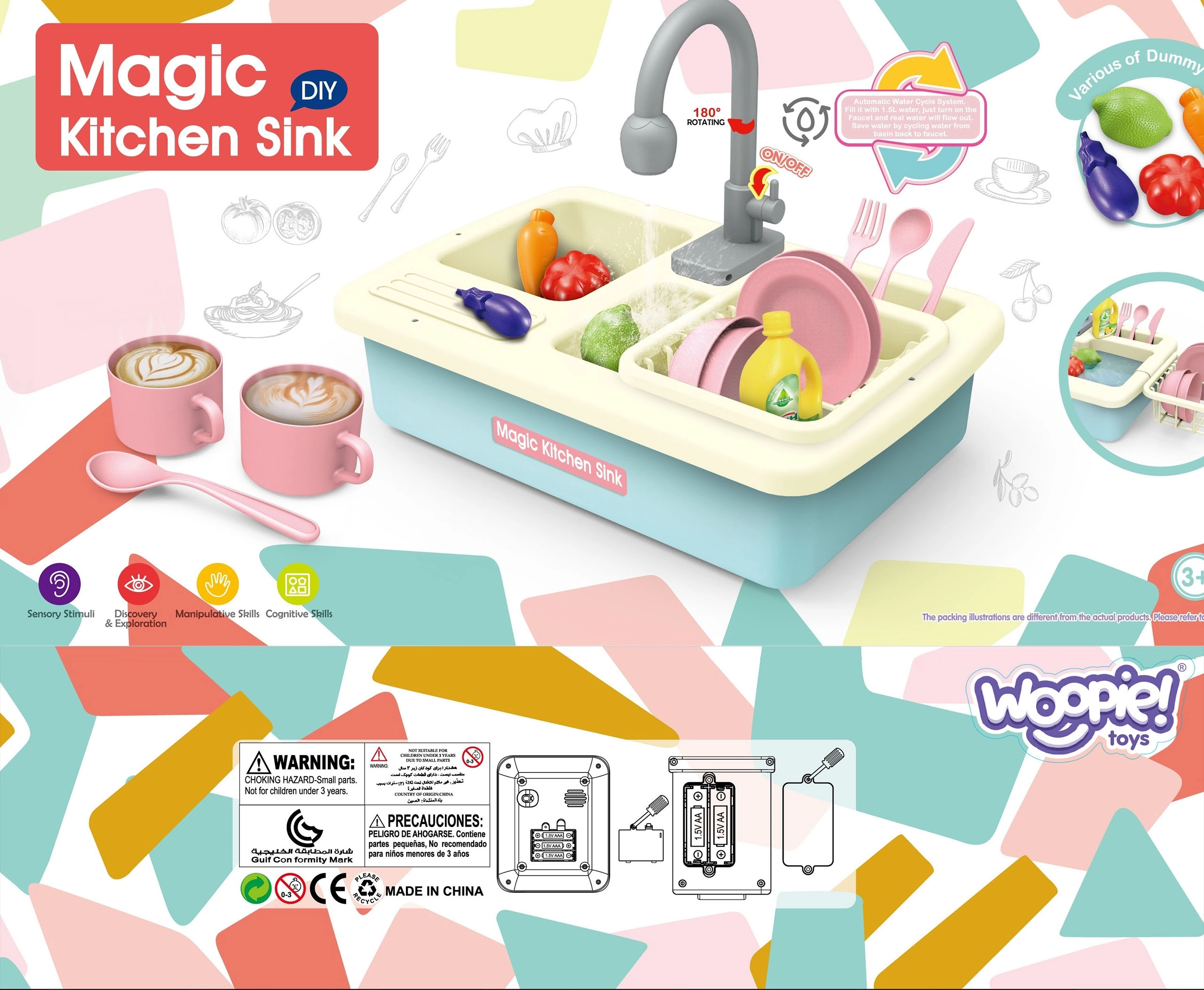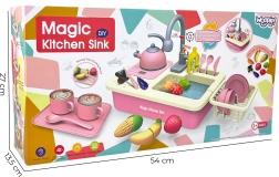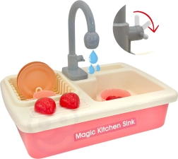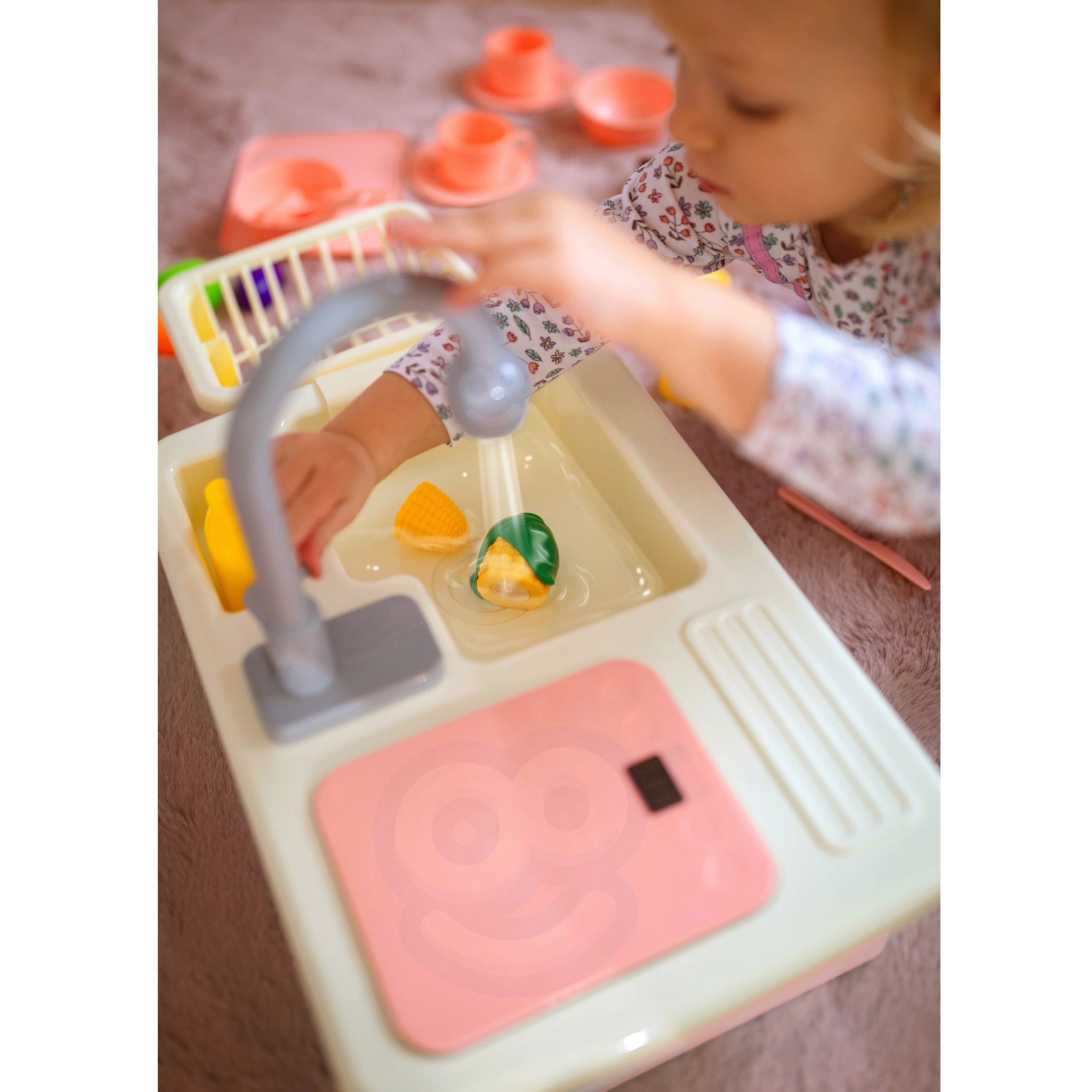 Запознайте се с интерактивната мивка, която след поставяне на 2× AA батерии активира помпа с водна циркулация – децата могат „наистина“ да мият съдове, да изплакват плодове и да тренират щадящо отношение към водата. Богатият комплект съдове, храни за рязане със сух цип и кухненски аксесоари развива въображението и координационните умения.