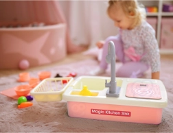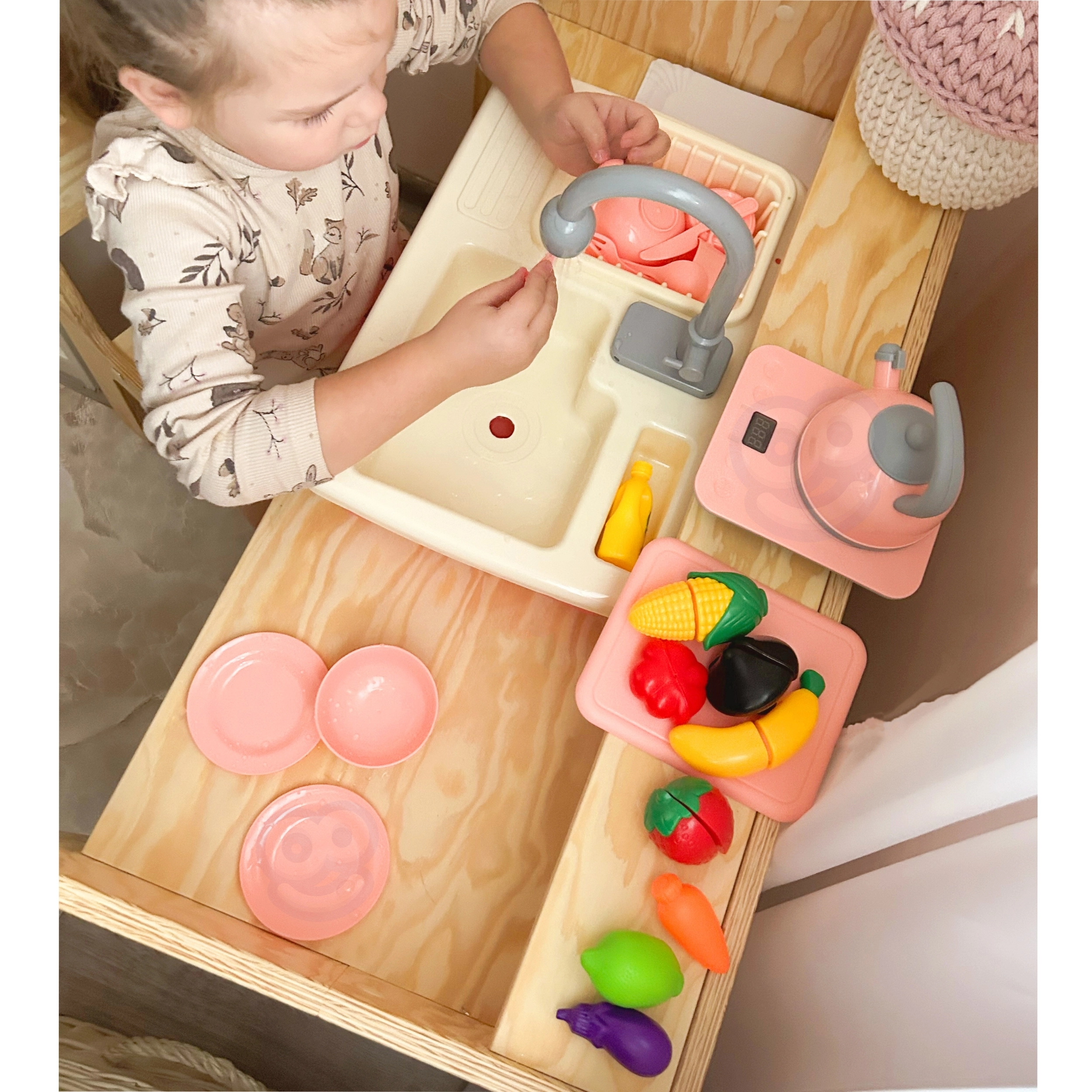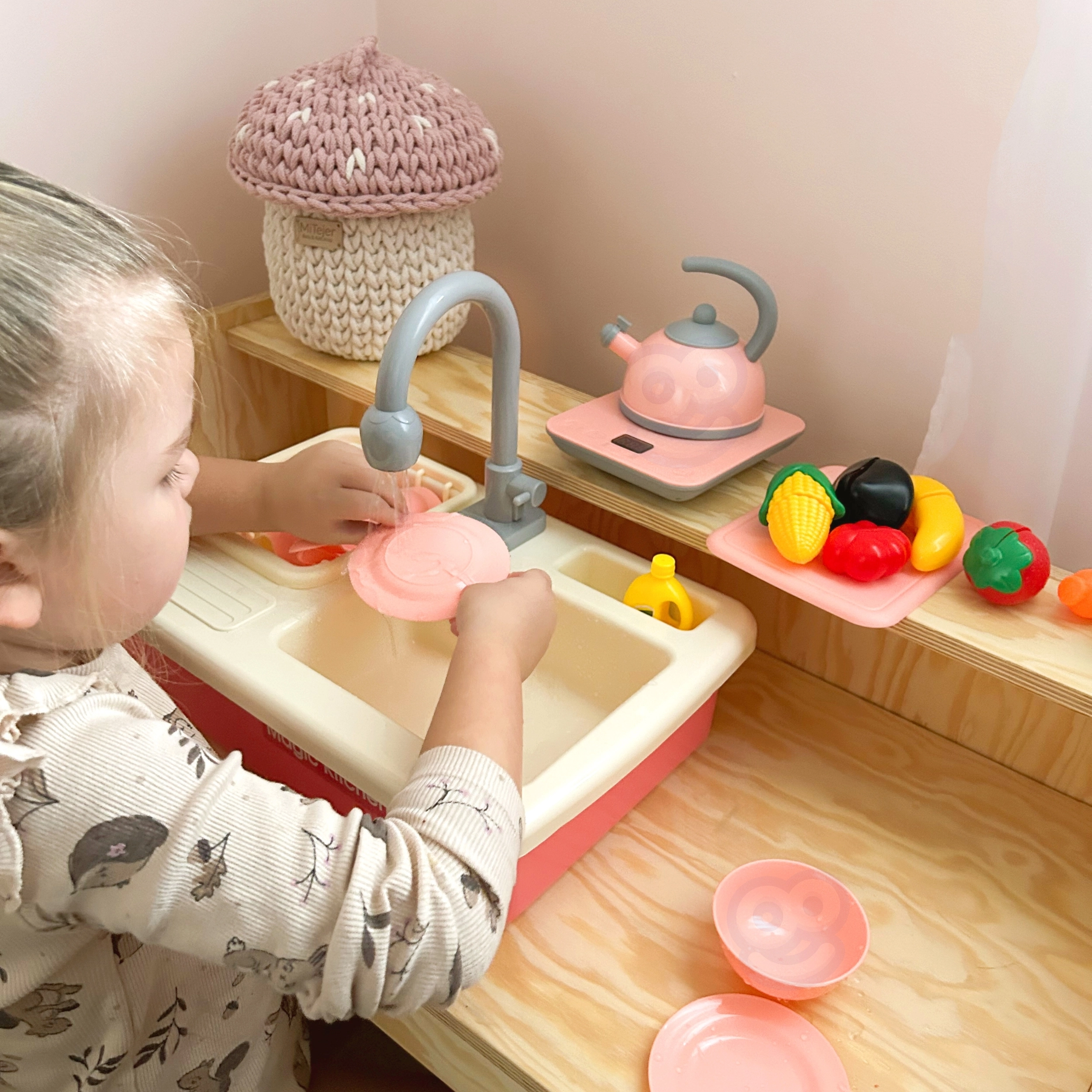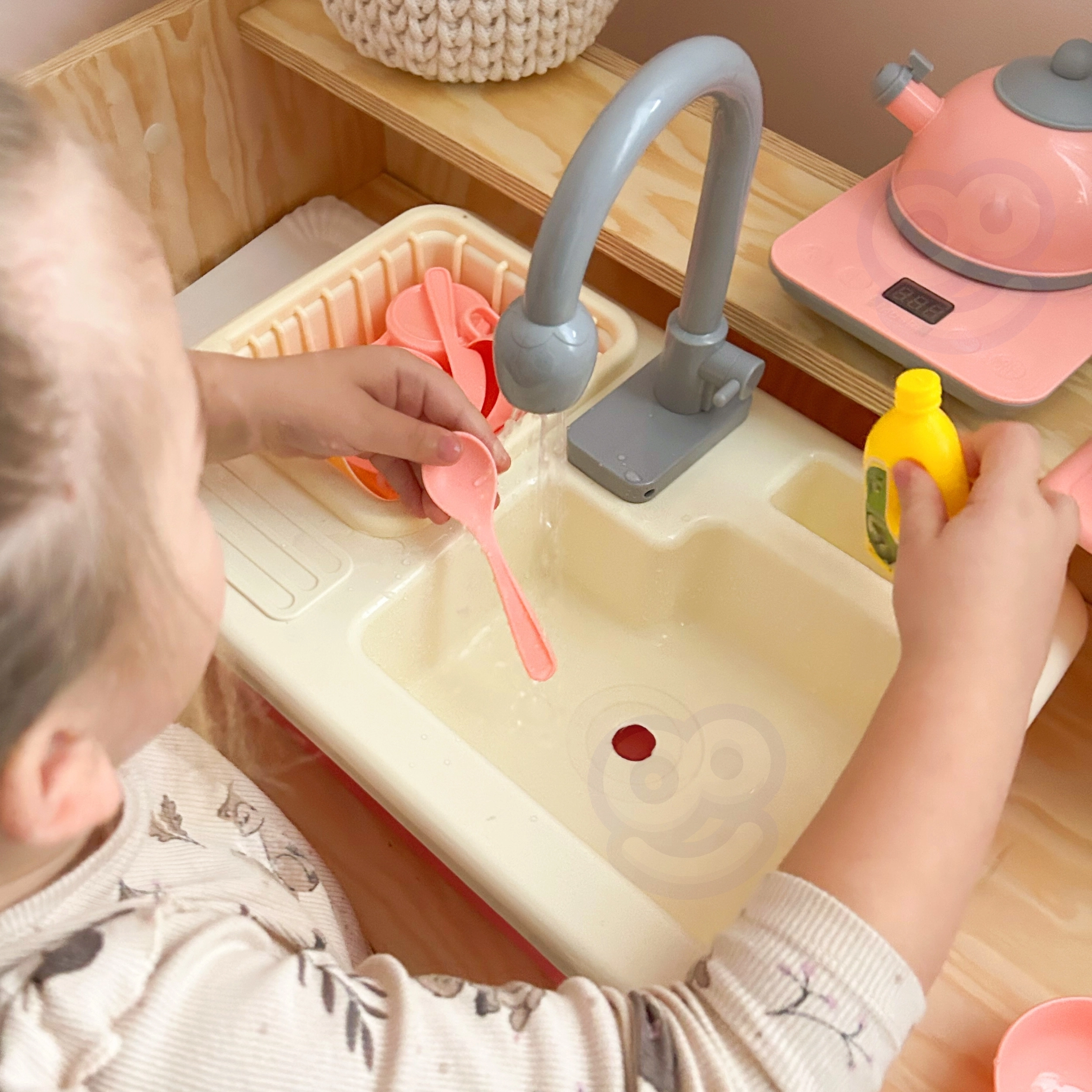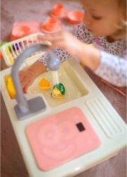 Децата лесно ще играят на готвачи и помощници у дома: сервират, режат, мият и подреждат. Така ненатрапчиво усвояват основите на хигиената и екологичния подход към водата, докато родителите ще оценят по-подредения игрови кът.
