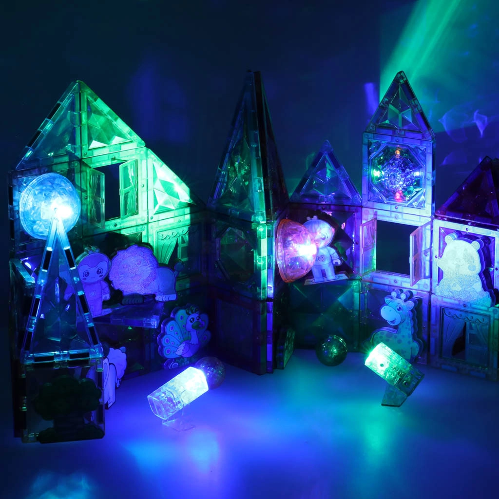 Със светещите магнитни кубчета децата могат да изграждат разнообразни структури и постройки — от прости 2D форми като животни и числа до сложни 3D конструкции. Кубчетата съдържат магнити, които позволяват лесно съединяване и разделяне без използване на сила. Някои кубчета също светят, което прави постройките още по-атрактивни, особено на тъмно.