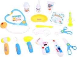 Стетоскоп, термометър, отоскоп, апарат за кръвно, спринцовка, ножички, скалпел, очила и още аксесоари – всичко за пълна игра на доктор.