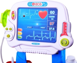 Детският монитор показва ЕКГ графика и съпровожда играта със светлини и звуци, което придава реалистично усещане на прегледа и държи децата въвлечени.