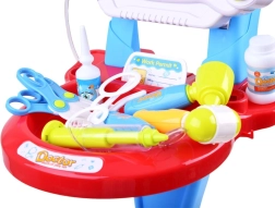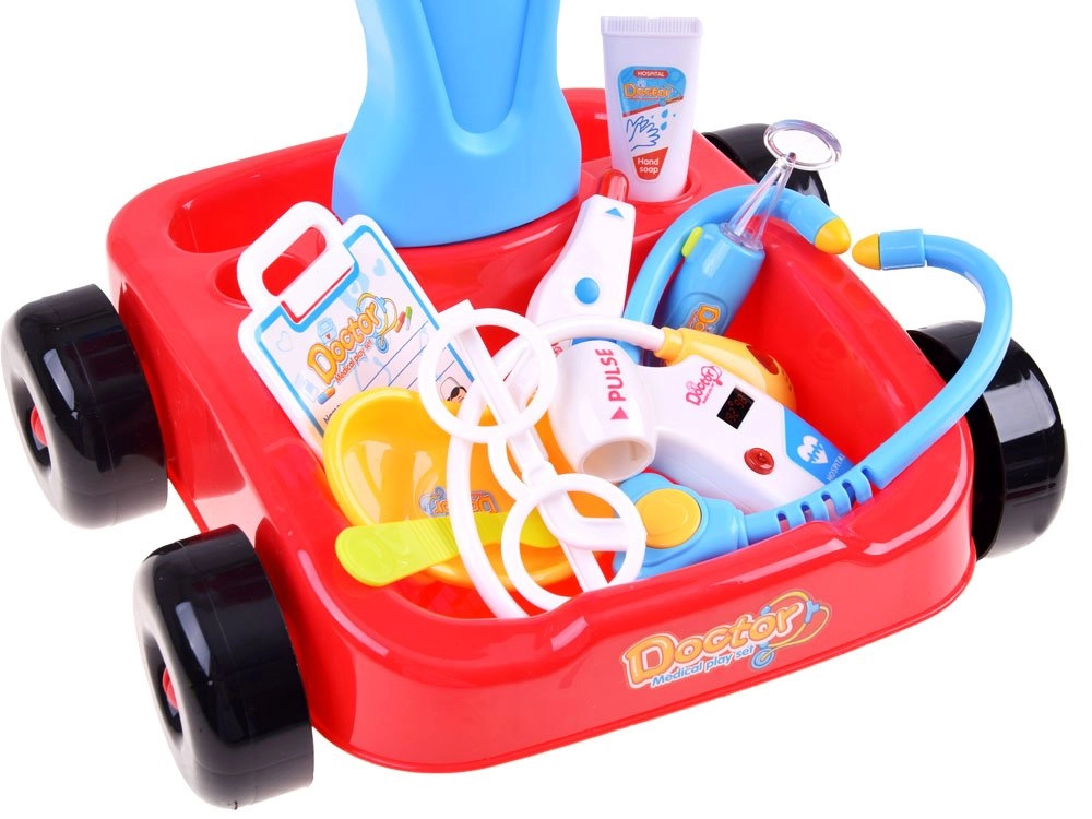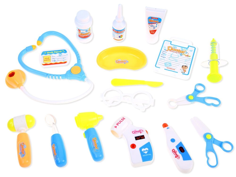 - Количка с монитор, очила, стетоскоп, термометър с регулиране и подсветка, отоскоп със светлина, апарат за кръвно с регулиране и подсветка, неврологично чукче, спринцовка, дентално огледалце със светлина, 2× ножички, скалпел, купичка, имитация на дезинфекциращ крем, капки за очи, кутийка с лекарства, бадж на лекар, карта на пациента
