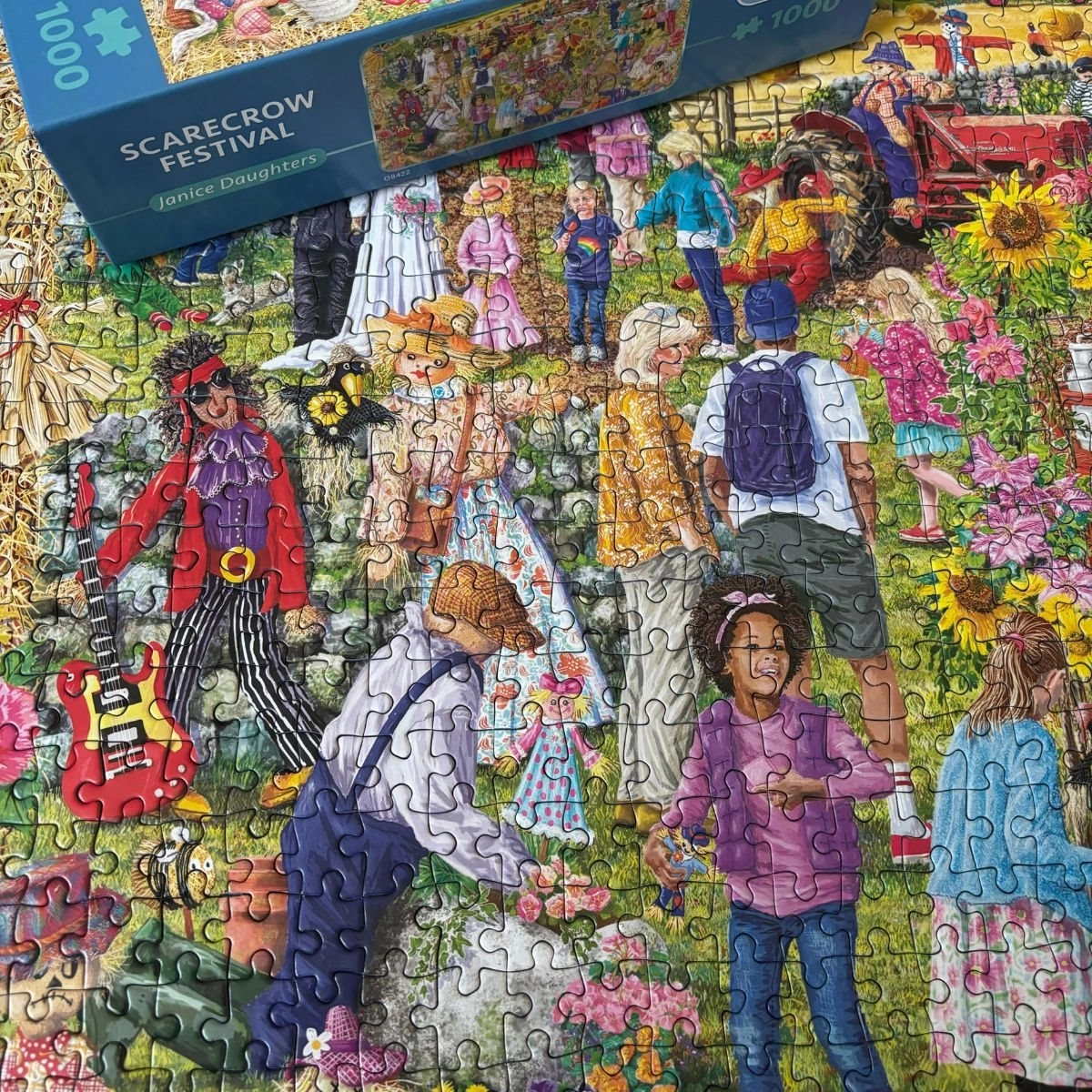 Пъзелът Scarecrow Festival, създаден от художничката Джанис Дотърс, представя детайлна и цветна сцена от есенен фестивал. Това произведение включва жива украса от слънчогледи и оригинални плашила, които ще зарадват всички почитатели на есента и традиционните фестивали. Идеален за отмора и релакс, подреждането на този пъзел е приятно забавление за всеки.
