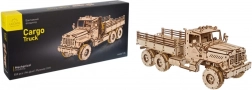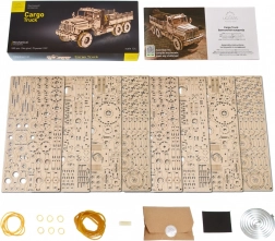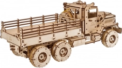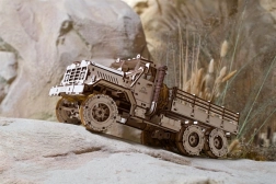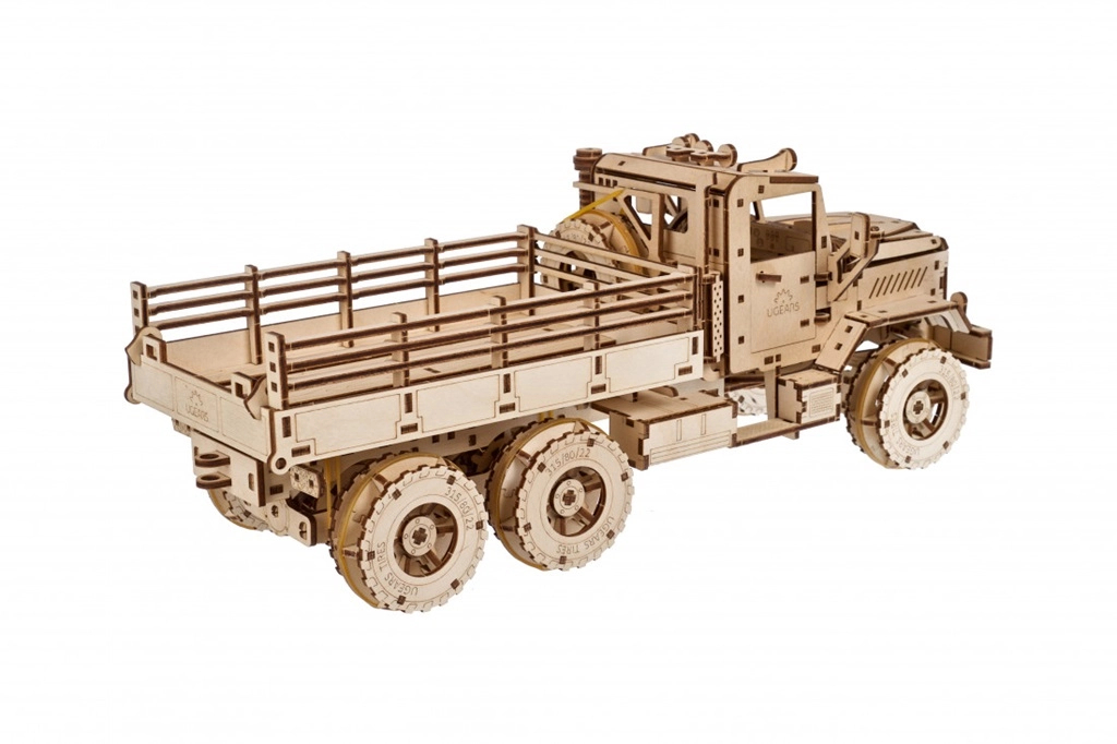 Насладете се на сглобяването на емблематичен товарен автомобил, вдъхновен от легендарните машини 6x6. Детайлен мотор под отварящия се капак, работещи дръжки на вратите, регулируеми огледала и падащи врати на товарното отделение подчертават автентичния вид и функционалността на модела. Пружинният мотор предава сила чрез два диференциала към предната и задната ос, така че моделът наистина се движи.