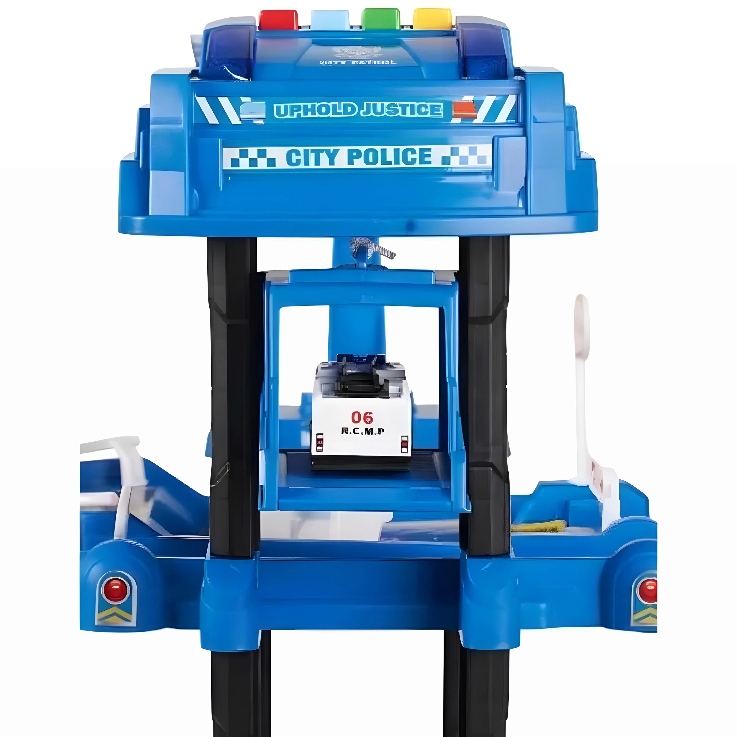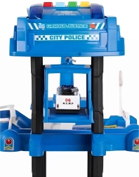 Открийте пететажни паркинг гаражи с полицейско управление, които ще зарадват всеки малък шофьор. Благодарение на реалистични детайли като рампи, бариери, знаци и хелипад на покрива, децата ще създават собствени истории и сценарии. Интерактивният асансьор отвежда колите чак до върха, където ги очаква ново действие.