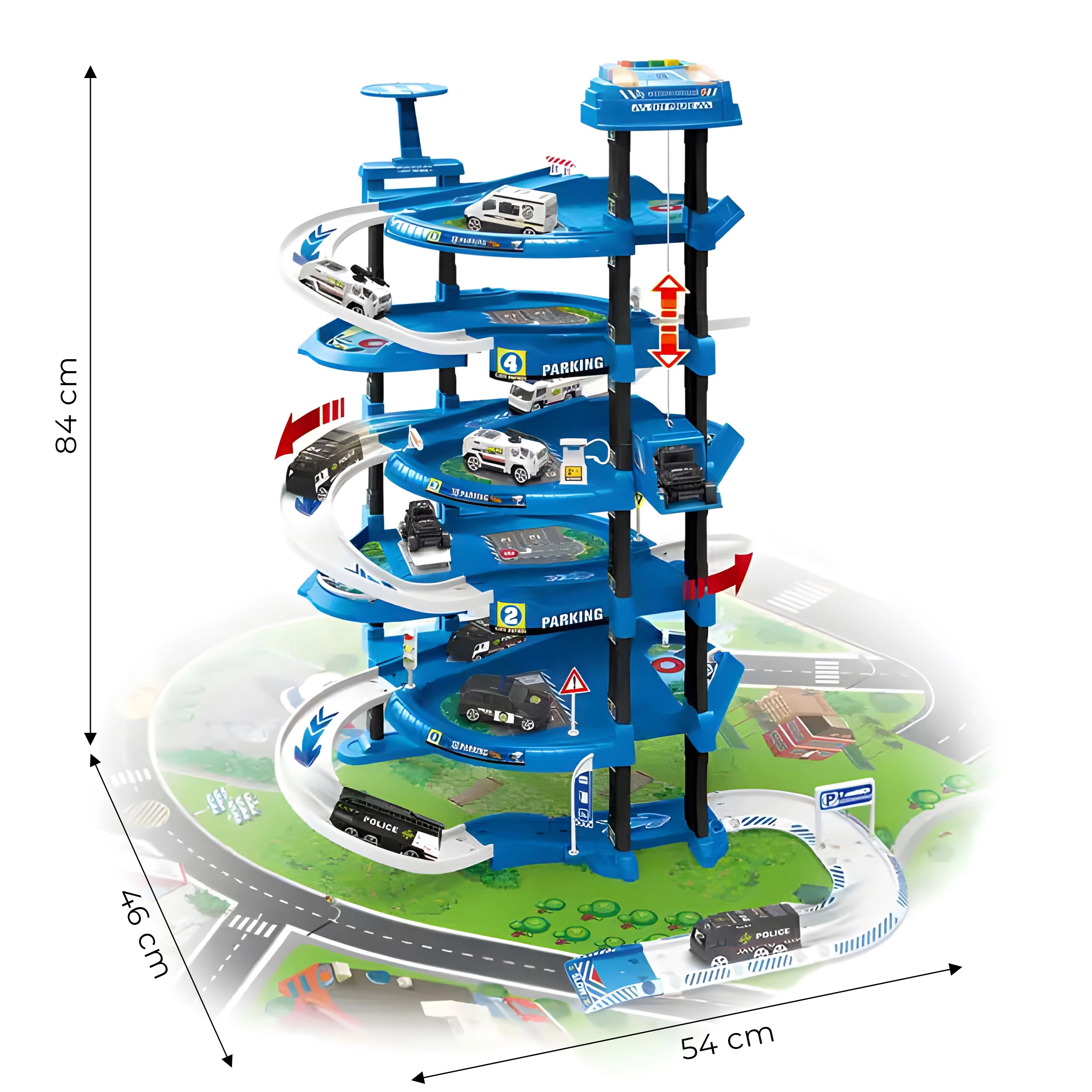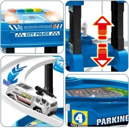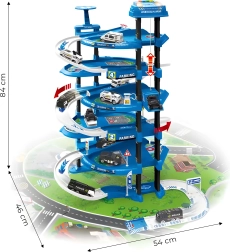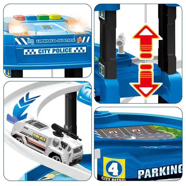 Голям полицейски паркинг сет с пет нива и площадка за кацане на хеликоптер носи часове креативна игра. Включва 2 коли и хеликоптер, подвижен асансьор, светлинни и звукови ефекти, бариери, знаци и градска игрова подложка. Безопасна изработка без остри ръбове, подходящ от 3 години, идеален за развитие на фантазията и фината моторика.