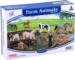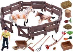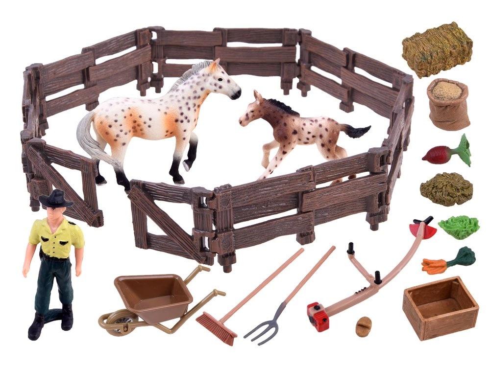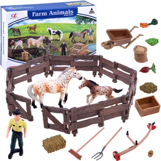 Този богато оборудван комплект пренася децата в света на фермата. В него ще открият две вярно пресъздадени фигурки на коне (кобила и жребче), фермер, ограда и множество аксесоари като ръчна количка, вили, грапа, хранилка и фураж. Реалистичните детайли – от текстурата на „дървото“ по оградата до оцветяването на конете – стимулират фантазията и дългите часове игра.