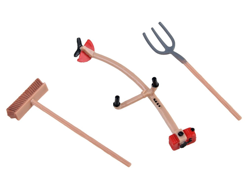 Фигурка на фермер, ръчна количка, грапа, вили и други аксесоари за реалистична работа във фермата.