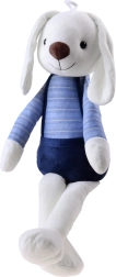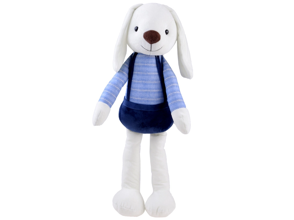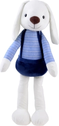 Зайчето е с височина приблизително 60 см, така че се държи удобно и от малки деца. Стилното облекло с райета и гащеризон придават на играчката отличителна визия, която децата бързо ще заобичат.
