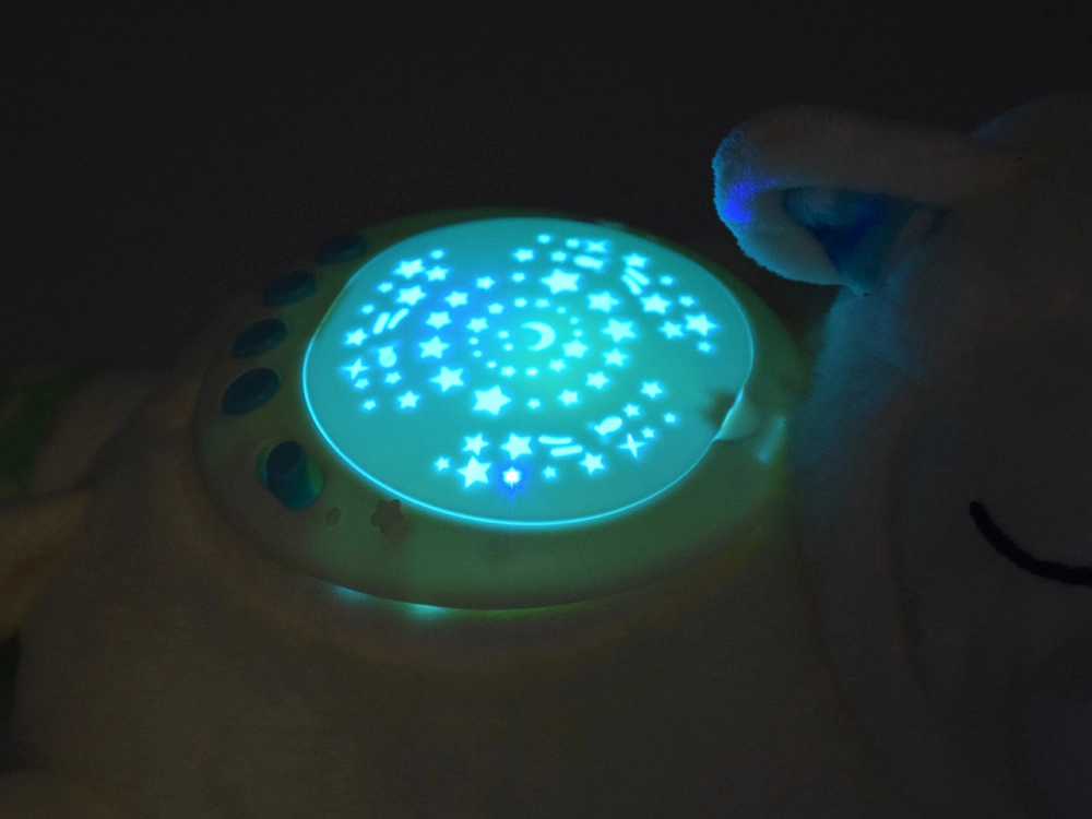 Интерактивният панел предлага проекция и светлина с няколко цвята (оранжев, син, зелен, червен), спокойни мелодии, природни звуци (дъжд, гора, птички, морски вълни) и пренатален сърдечен ритъм. Светлината може да се настрои според настроението – цветовете могат да светят поотделно или плавно да преминават един в друг, а диодите нежно се усилват и приглушават. Времето за възпроизвеждане на звуци и мелодии е около 15 минути, след което играчката се изключва автоматично.
