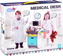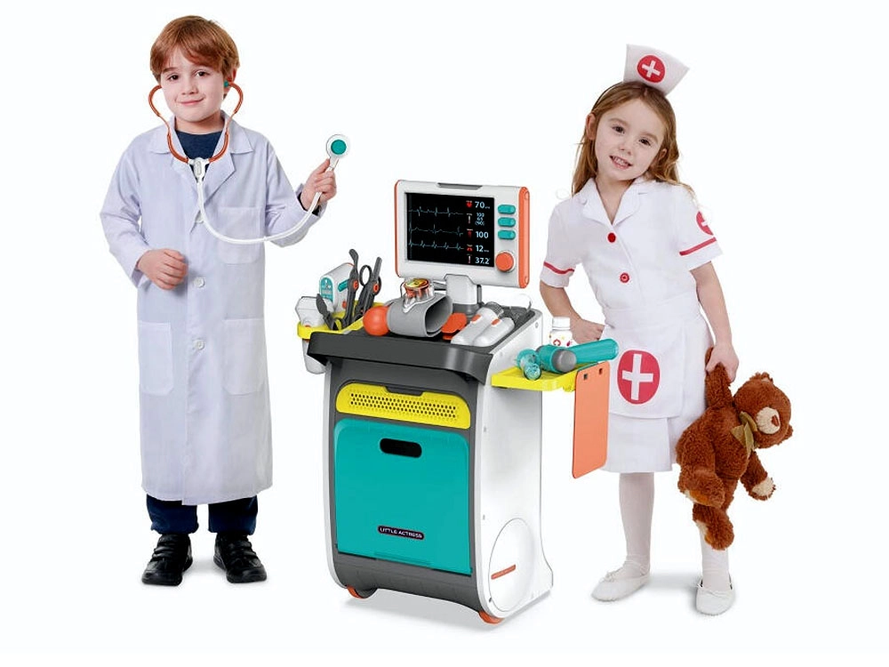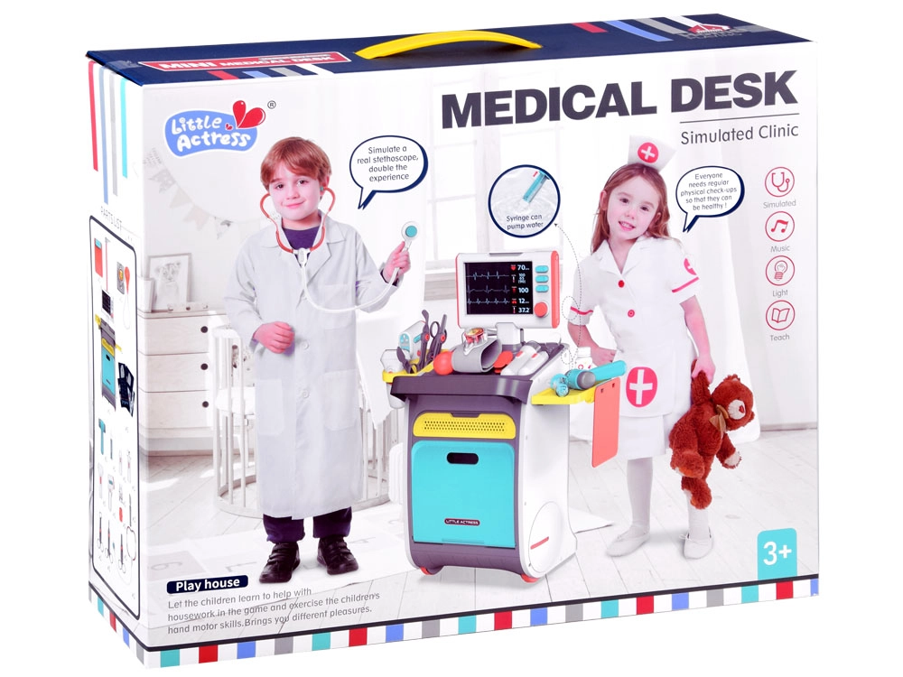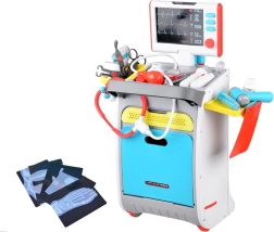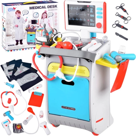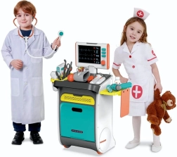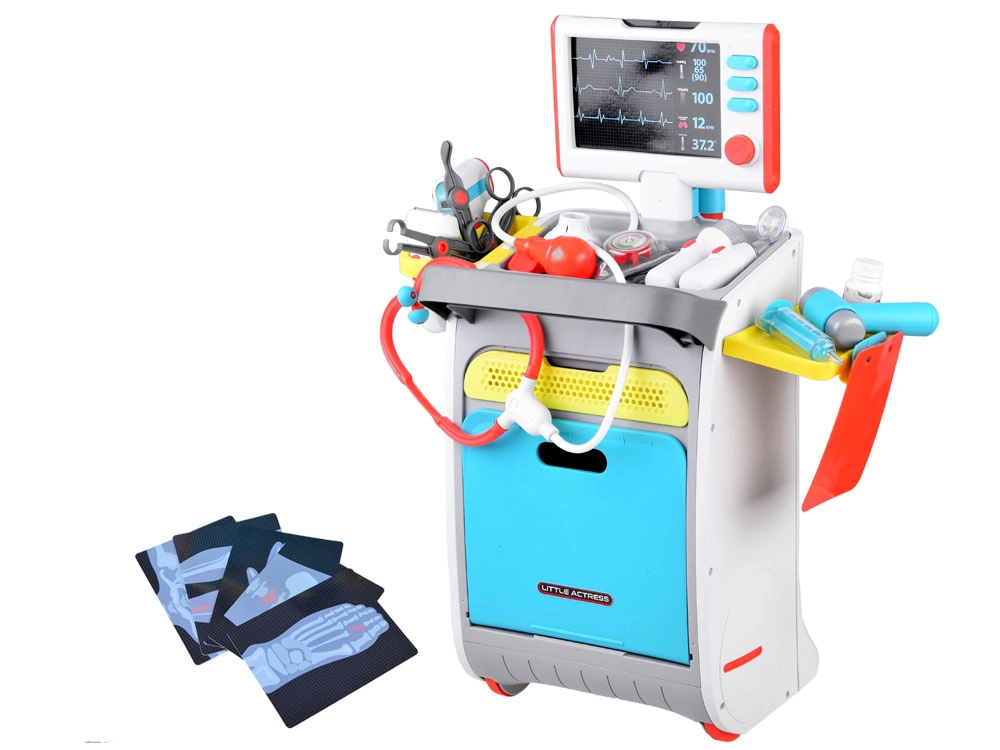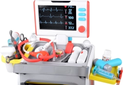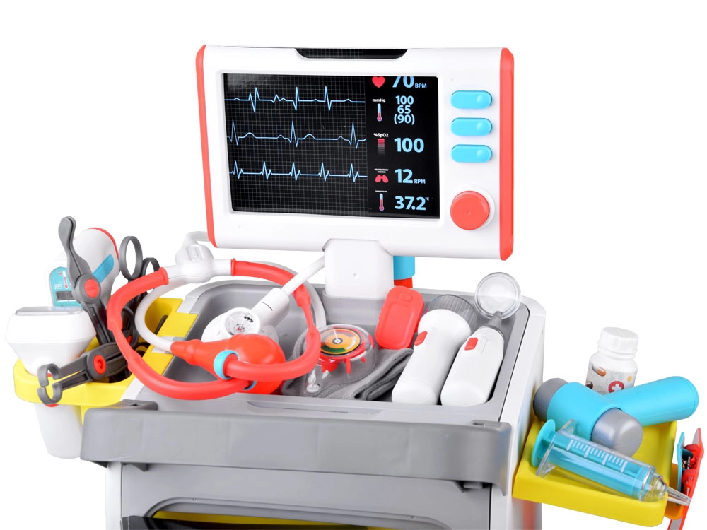 Комплектна детска медицинска количка на колела предлага реалистична игра на доктор още от 3 години. Включва интерактивни инструменти, монитор ЕКГ/РТГ със звук, мивка и стерилизатор за инструменти, отделни рафтове и чекмеджета и ръстомер до 112 cm. Здравата изработка и пъстрите цветове подкрепят креативната и образователна игра.