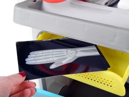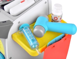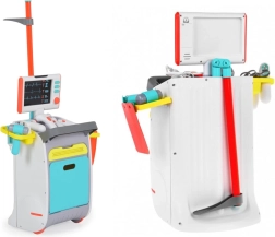 Детската медицинска количка е отлично оборудван комплект за малки медици. Благодарение на реалистични функции като монитор ЕКГ/РТГ със звук, ръстомер и място за инструменти, децата лесно се потапят в ролята на доктор. Качествената пластмасова изработка и лесното придвижване благодарение на колелцата гарантират часове безопасно и творческо забавление.