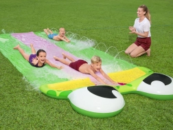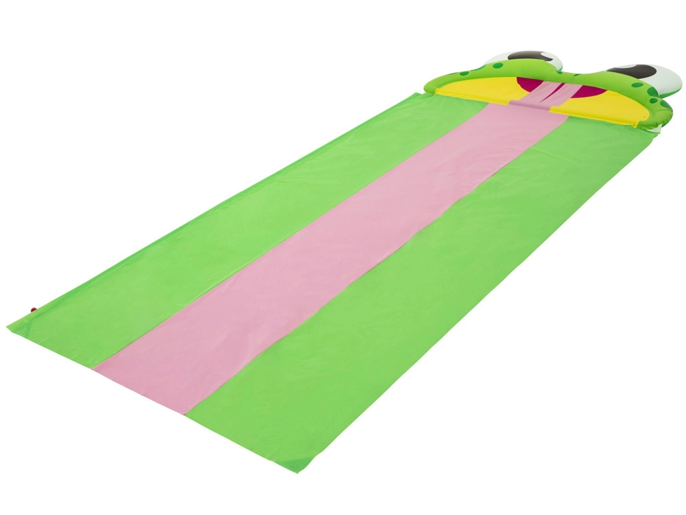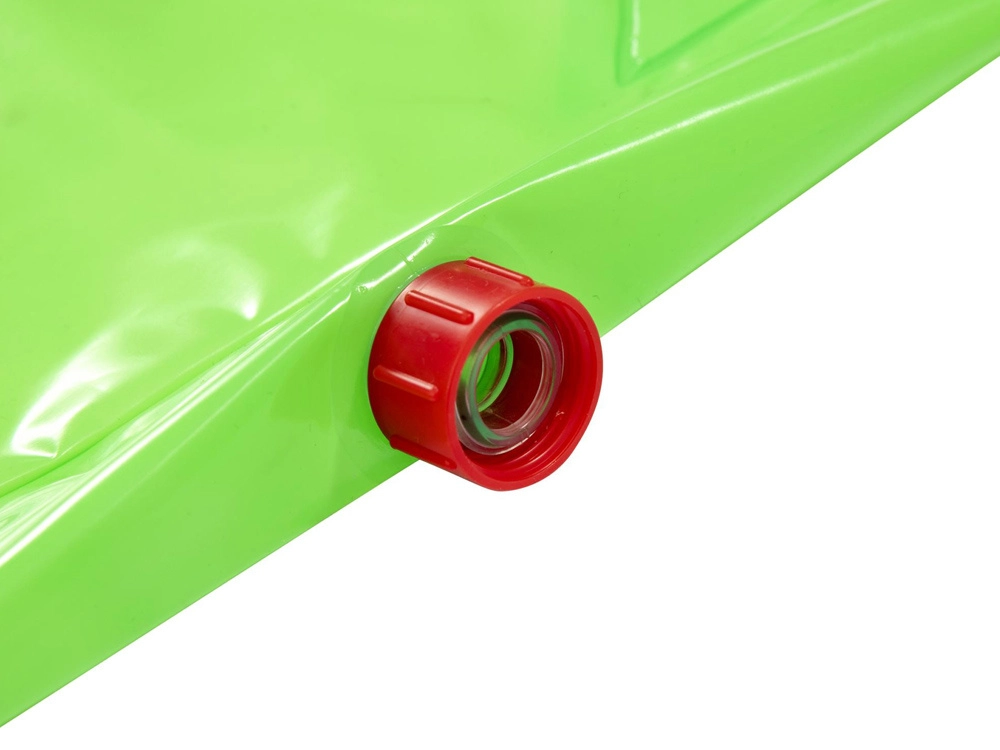 Монтажът е бърз и лесен – просто разгънете пързалката на тревата, свържете градинския маркуч и забавлението може да започне!