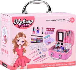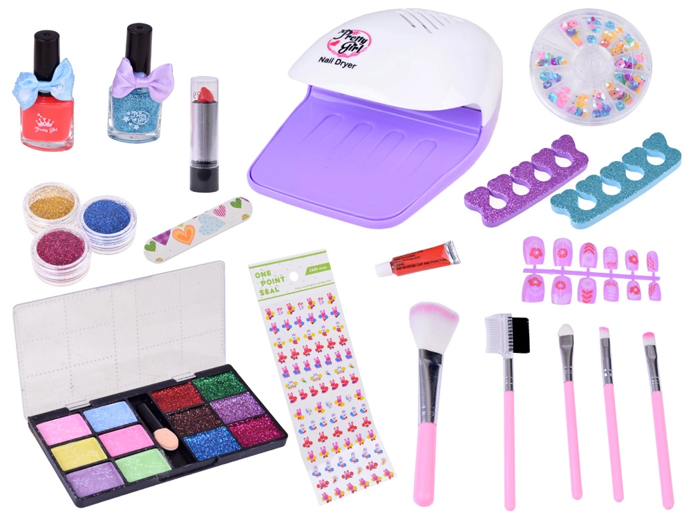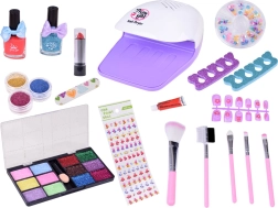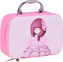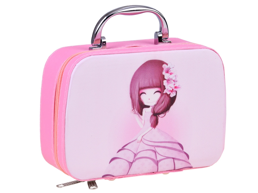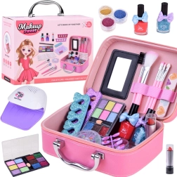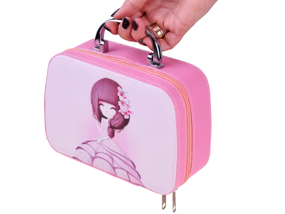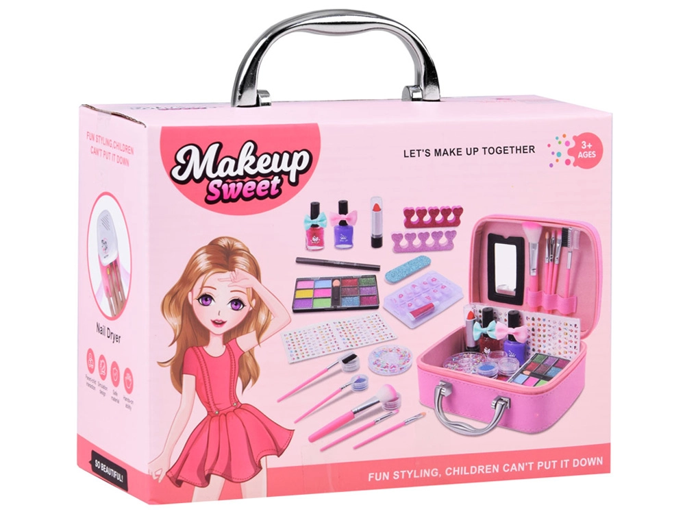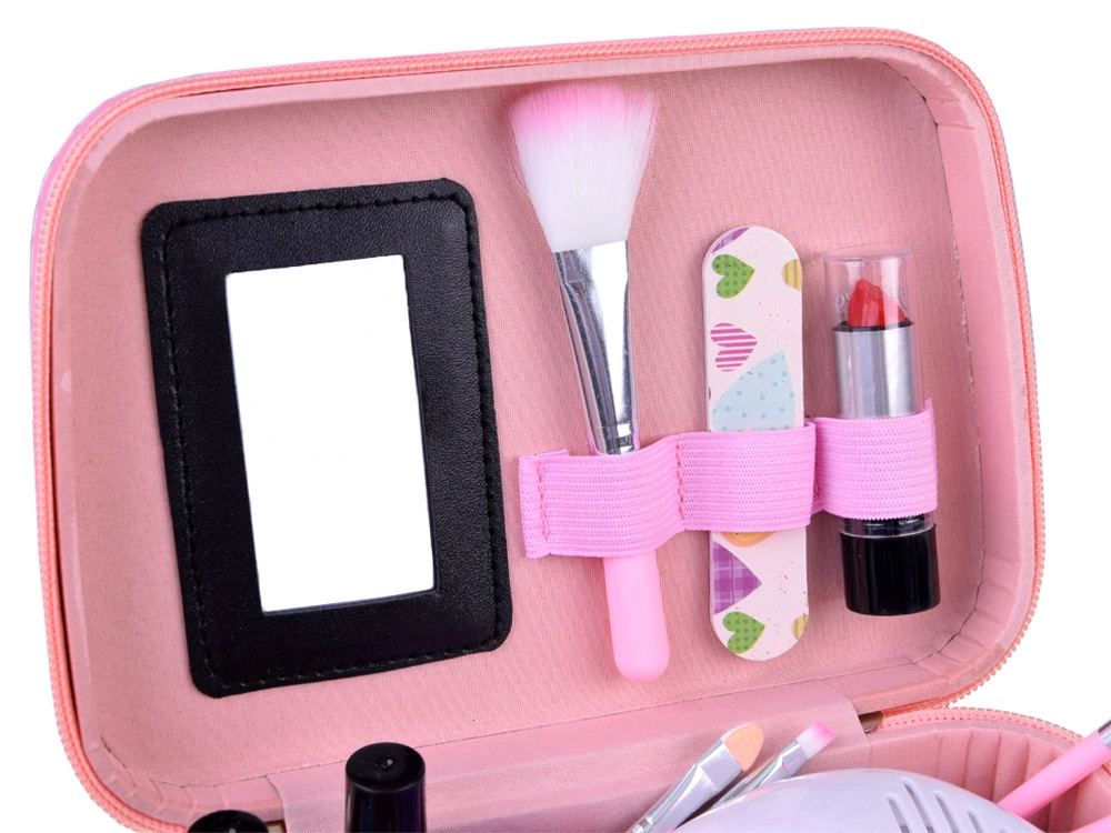 Това очарователно куфарче е изпълнено с качествени козметични принадлежности за създаване на красиви нокти и грим. Куфарчето с вградено огледалце и държачи за козметика е идеално за всяка малка стилистка. Благодарение на удобната дръжка можете лесно да го вземете със себе си, където и да отидете. Комплектът включва: