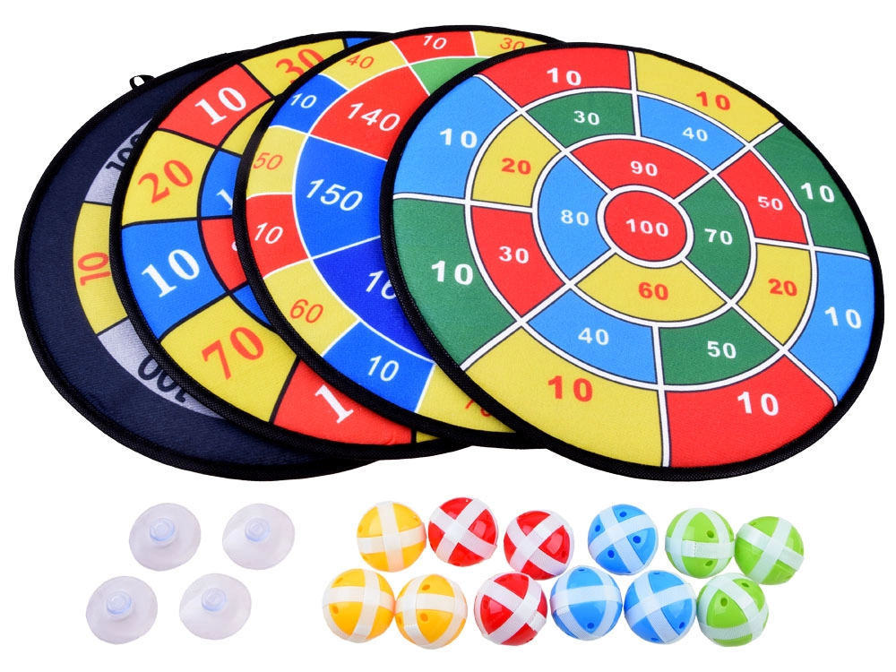 - Пълен комплект: 4 кръгли мишени (36 см), 12 топчета, 4 вендузи