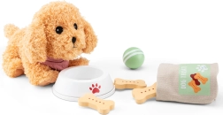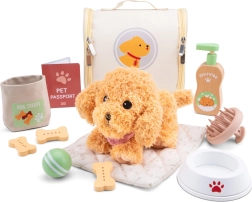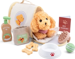 Съдържа всичко необходимо за грижата за плюшеното кученце. Детайли като транспортна клетка, четка и лакомства въвличат децата в играта и ги учат на отговорност.
