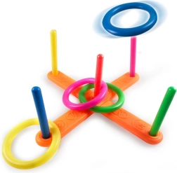 При хвърляне на ринговете към колчетата децата естествено тренират координацията око–ръка, точността и концентрацията. Идеално за общи игри на цялото семейство.