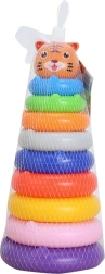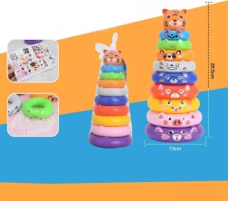 Забавна и образователна стакваща пирамида с рингове в различни размери и цветове, допълнена от сладко тигърче на върха. Подпомага фината моторика, координацията ръка–око и ученето на цветове, форми и размери. Включени са стикери с животни за креативна персонализация.