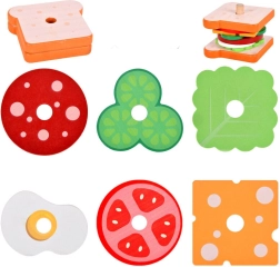 Забавен и образователен дървен комплект за сандвичи с 8 части и 10 карти с рецепти, който развива фината моторика, координацията око–ръка и креативността. Висококачествените дървени елементи са издръжливи и безопасни, идеални за деца от 3 години.