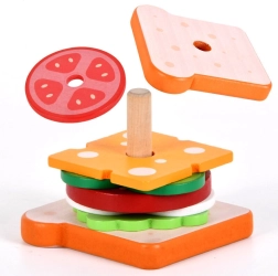 Този цветен дървен комплект позволява на децата да подреждат свои „сандвичи“ по фантазия или по приложените карти с поръчки. Благодарение на простите визуални инструкции децата лесно възпроизвеждат рецептите, учат се да различават цветове и форми и тренират планиране стъпка по стъпка.