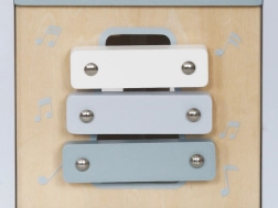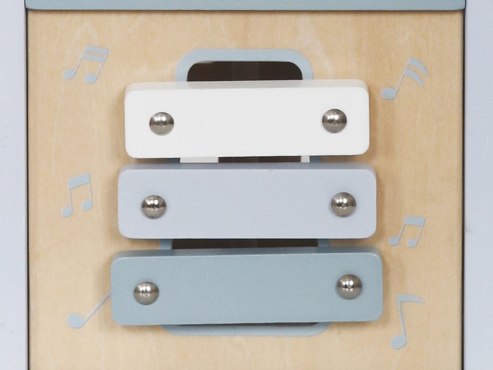 - Музикален инструмент: От едната страна има малък ксилофон, който позволява на детето да изследва звуци и ритми.